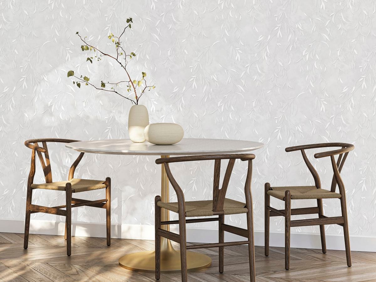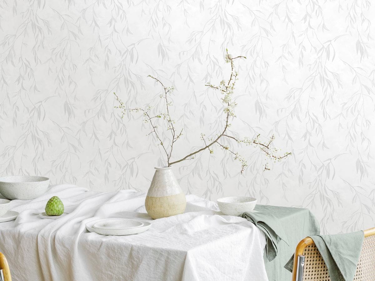 На благородном фоне, с текстурой штукатурки, словно парят изящные ветви с легкими, почти невесомыми листьями, причем, на ваше усмотрение ветки могут «расти» вниз и вверх.