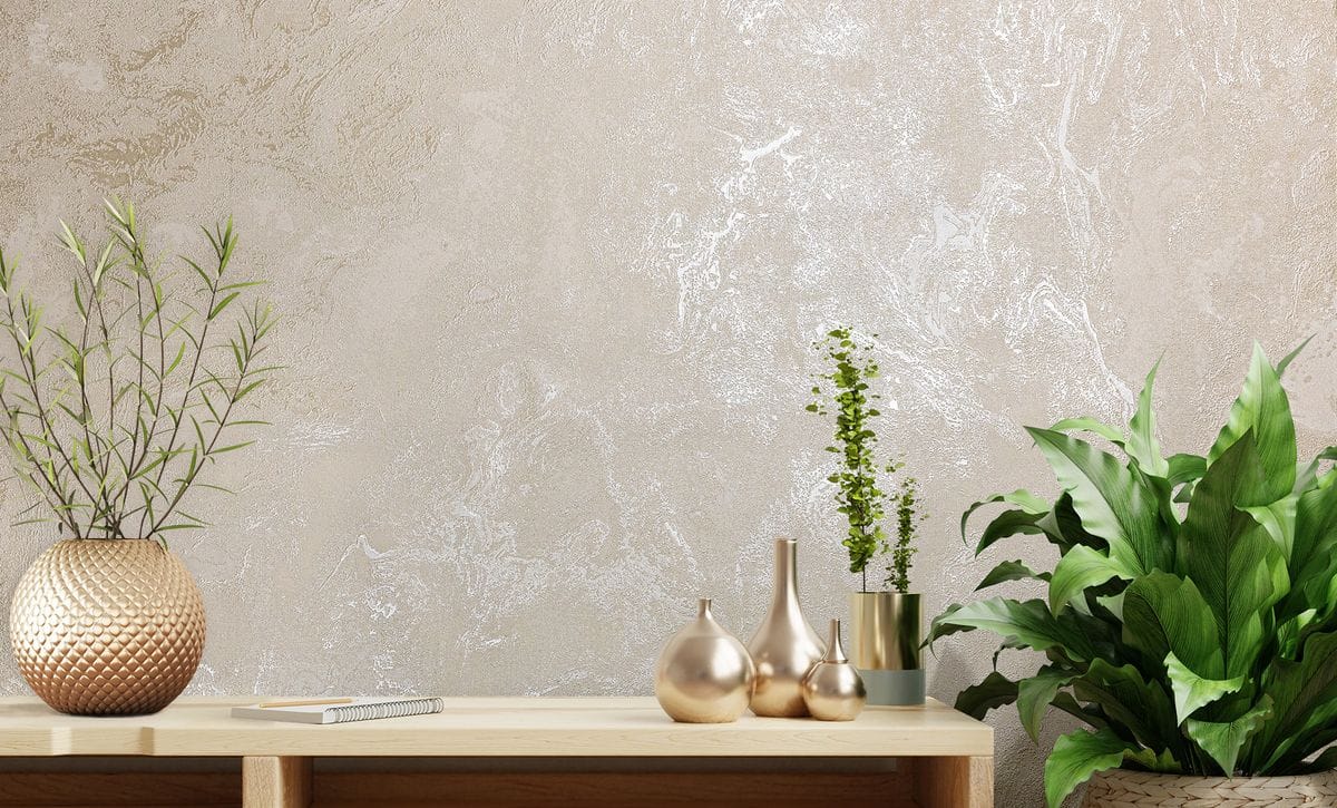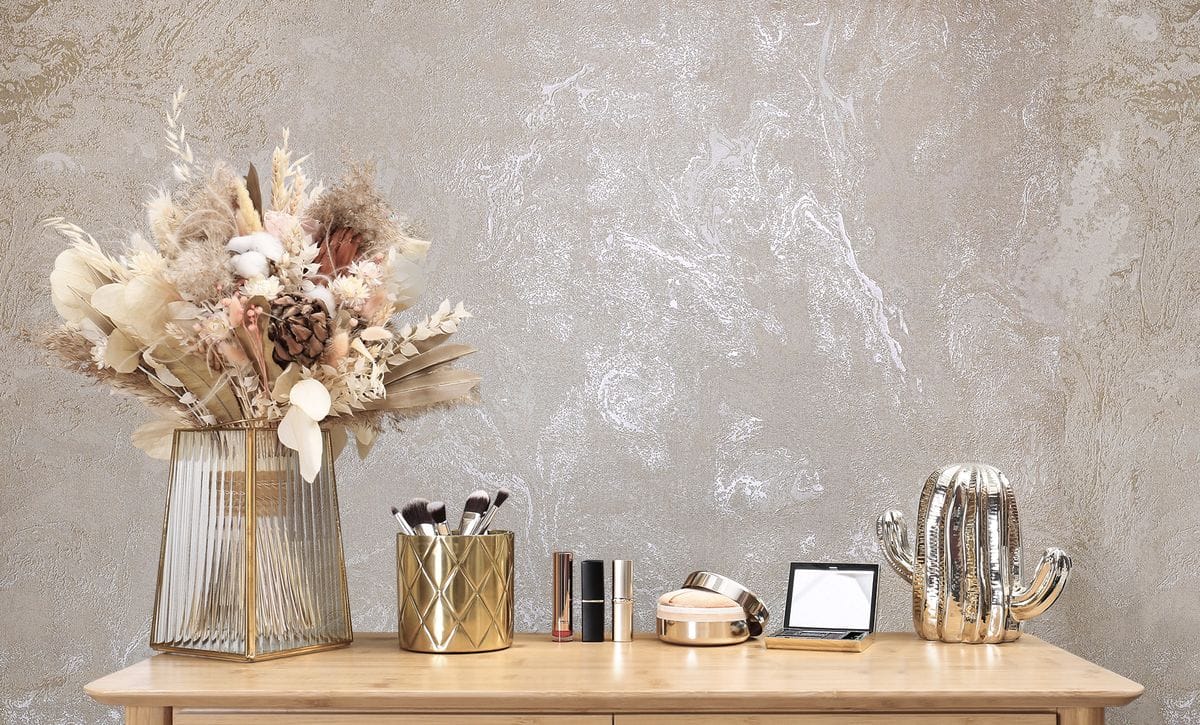 Поверхность обоев обладает деликатным перламутровым свечением, которое красиво раскрывается при различном освещении, подчёркивая фактуру и добавляя интерьеру благородный объём.