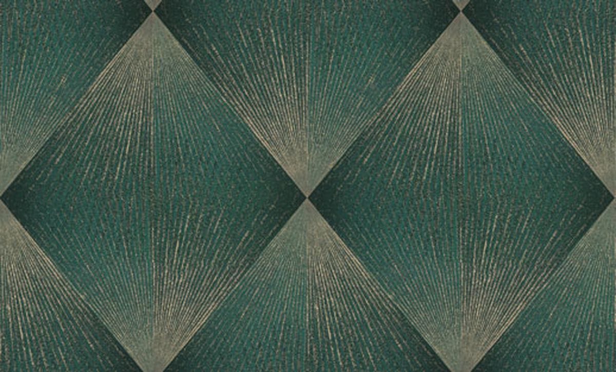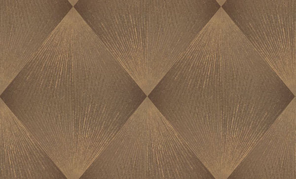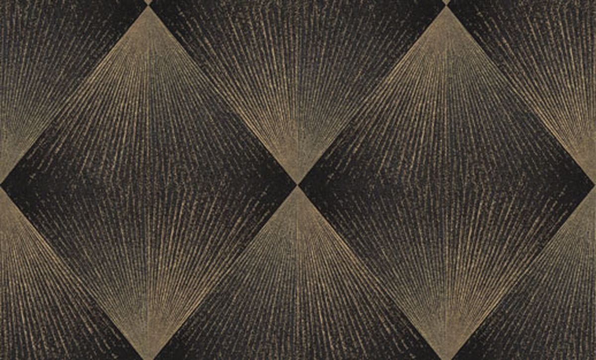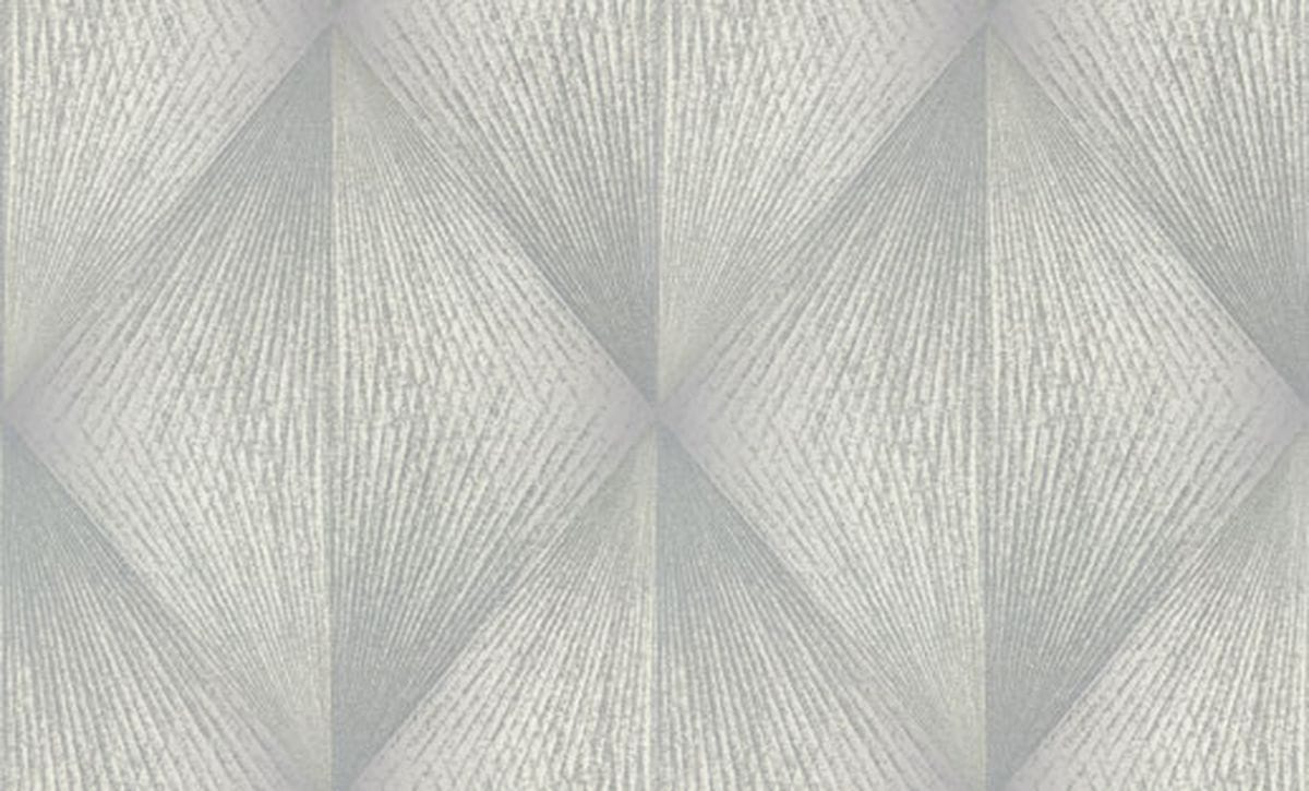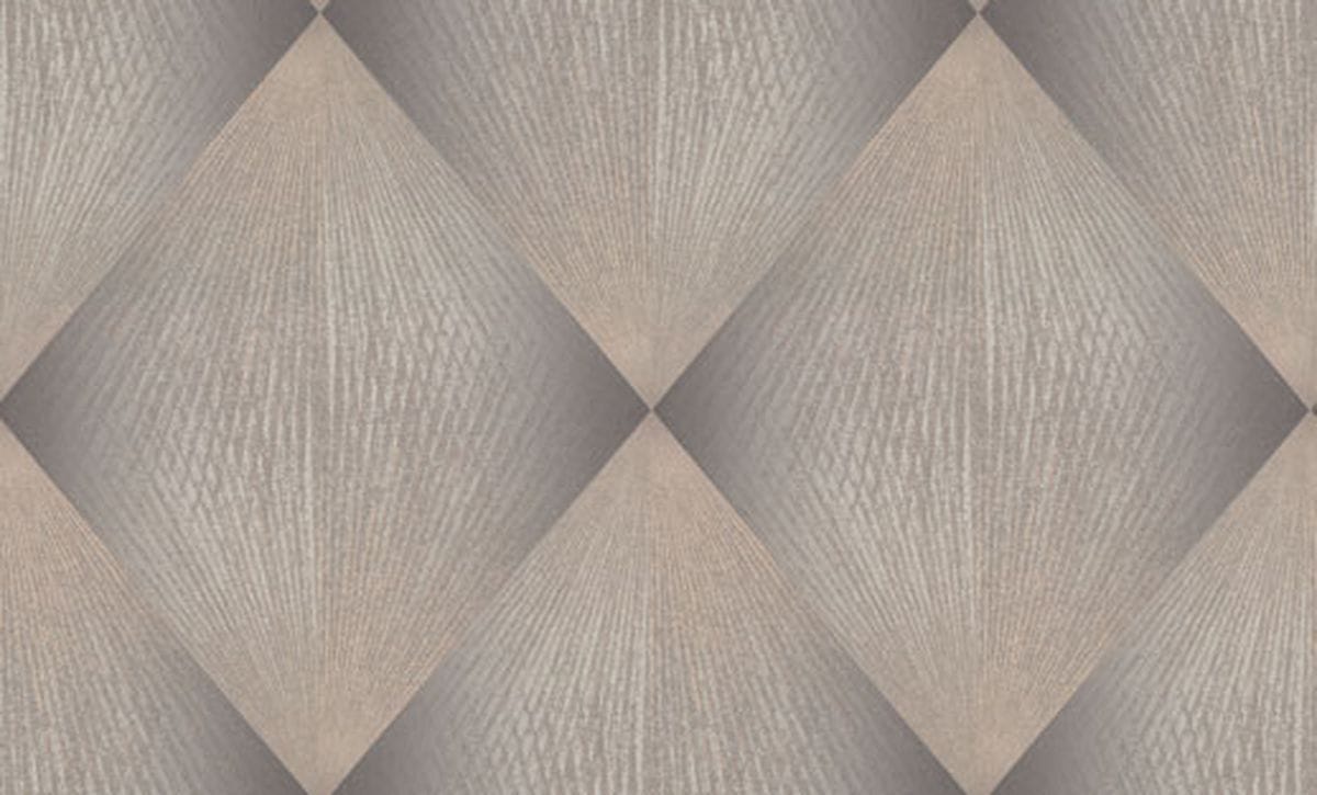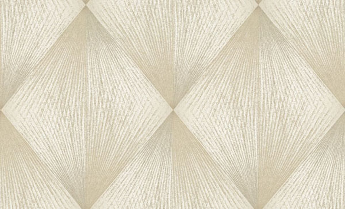 Каждый ромб состоит из лучеобразных линий, расходящихся из одной точки и создающих эффект движения. Благодаря этому узор выглядит динамичным: линии словно распространяются по поверхности, образуя сложную игру света и тени. Особую роль в композиции играет глиттер. Тонкие сверкающие частицы аккуратно вплетены в рисунок и повторяют направление линий узора, подчеркивая его геометрию и глубину. Фактура имитирует текстильную ткань с тонким переплетением нитей, благодаря чему обои выглядят благородно. Цветовая палитра построена на сложных оттенках. В неё входят тёплые бежевые и кремовые тона, мягкие песочные оттенки, благородные серые и графитовые цвета, а также глубокие тёмные вариации — от шоколадно-коричневого до насыщенного бирюзового оттенка. Коллекция дополнена однотонными фонами, которые идеально сочетаются с основным узором.