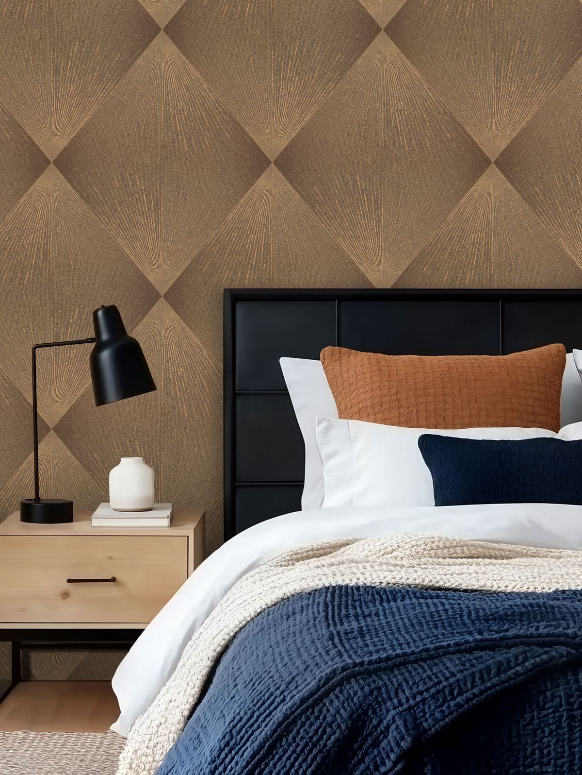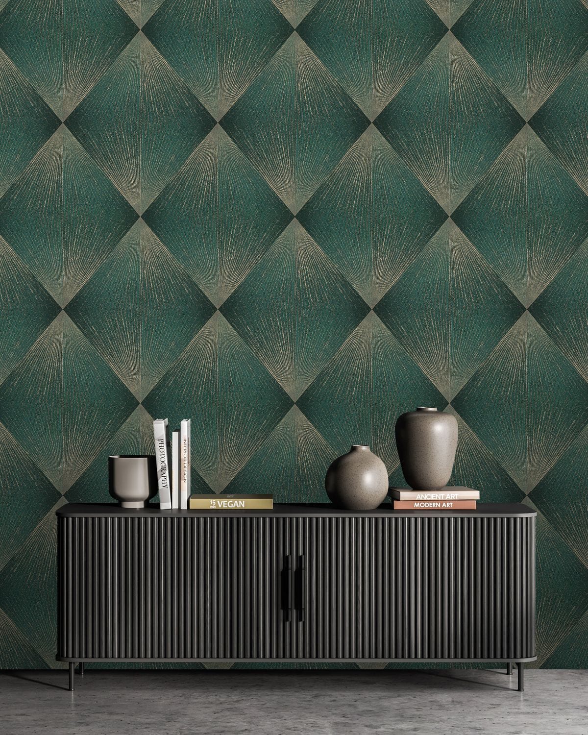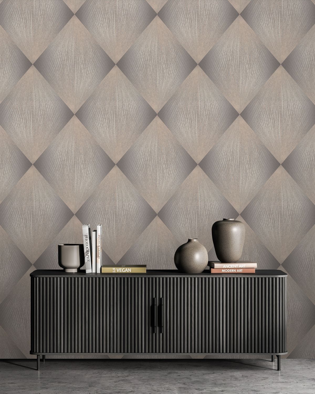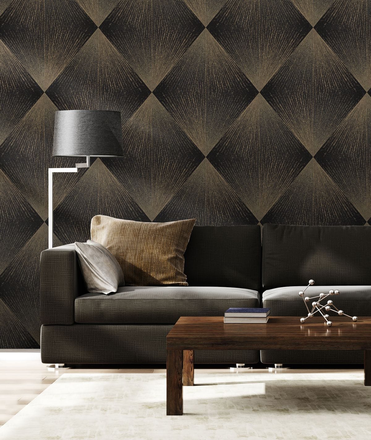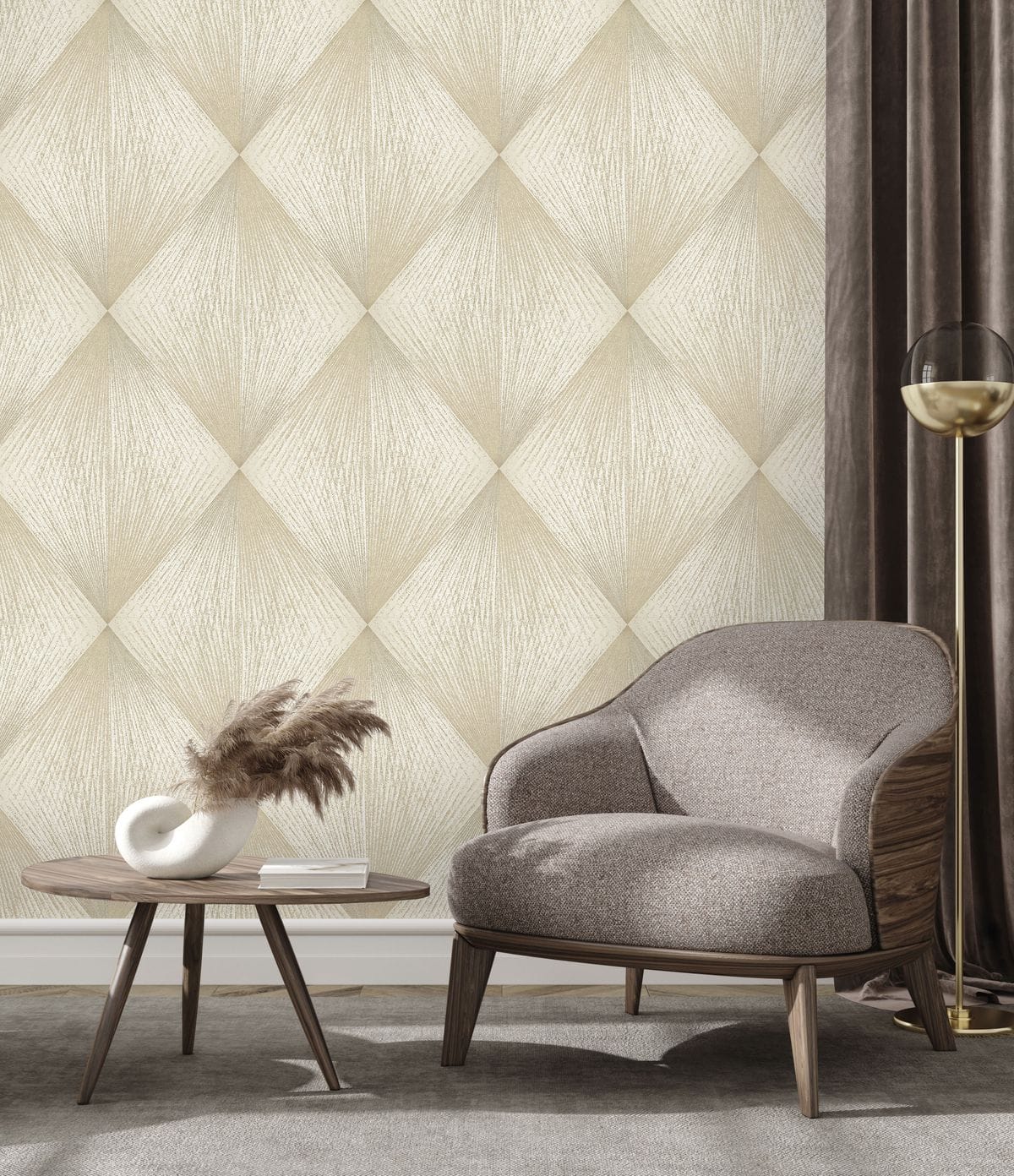 Каждый ромб состоит из лучеобразных линий, расходящихся из одной точки и создающих эффект движения. Благодаря этому узор выглядит динамичным: линии словно распространяются по поверхности, образуя сложную игру света и тени. Особую роль в композиции играет глиттер. Тонкие сверкающие частицы аккуратно вплетены в рисунок и повторяют направление линий узора, подчеркивая его геометрию и глубину. Фактура имитирует текстильную ткань с тонким переплетением нитей, благодаря чему обои выглядят благородно. Цветовая палитра построена на сложных оттенках. В неё входят тёплые бежевые и кремовые тона, мягкие песочные оттенки, благородные серые и графитовые цвета, а также глубокие тёмные вариации — от шоколадно-коричневого до насыщенного бирюзового оттенка. Коллекция дополнена однотонными фонами, которые идеально сочетаются с основным узором.