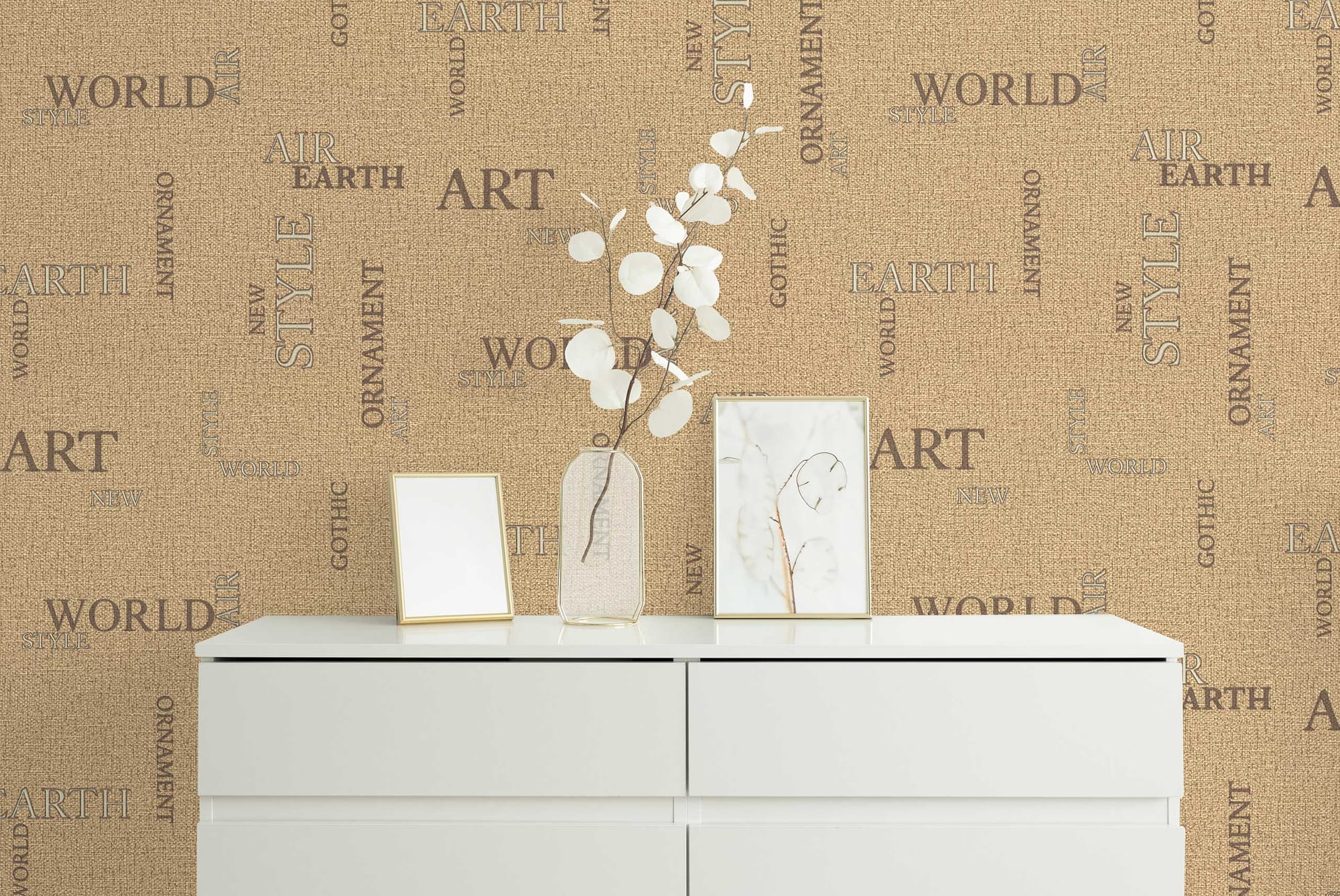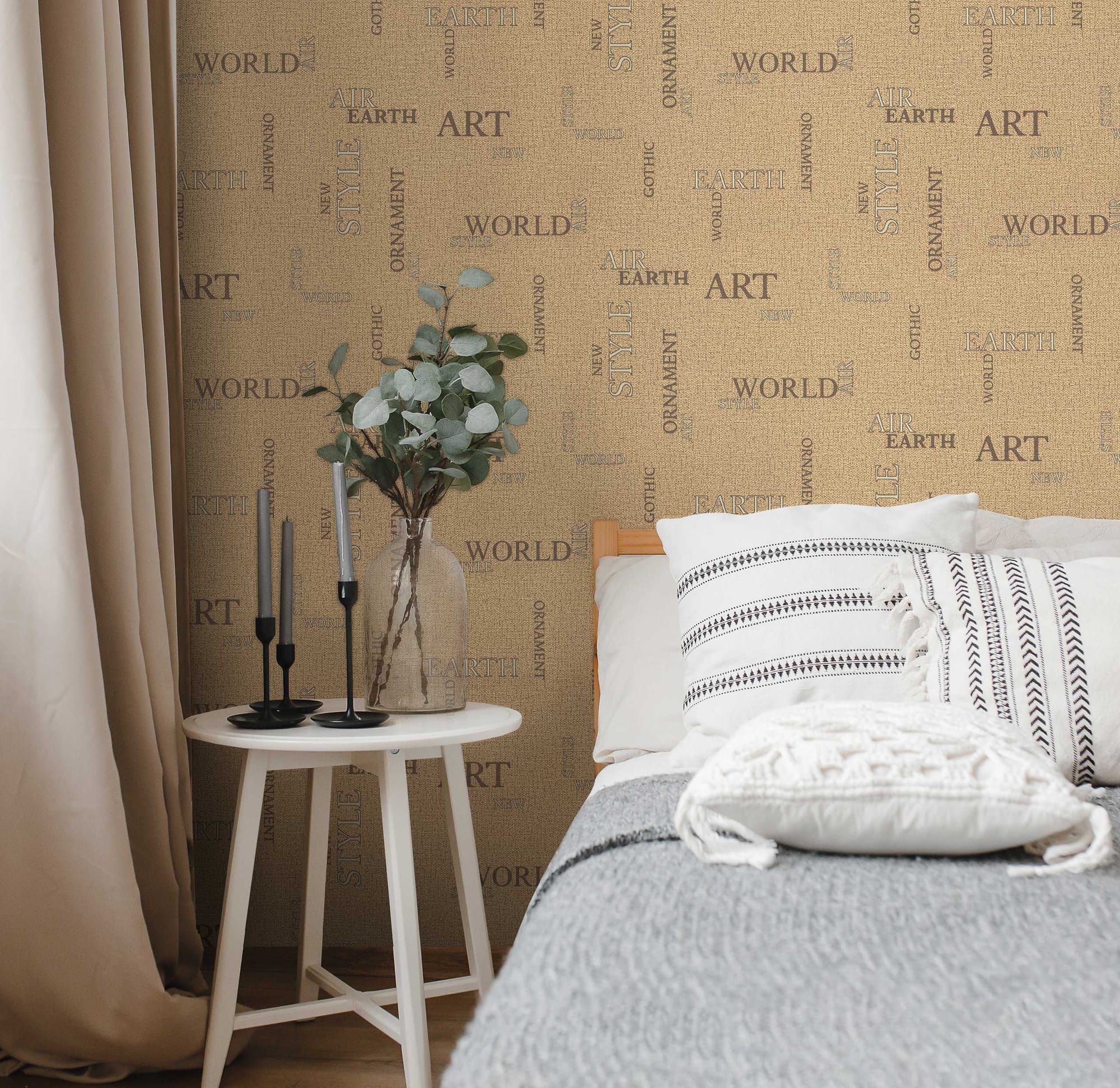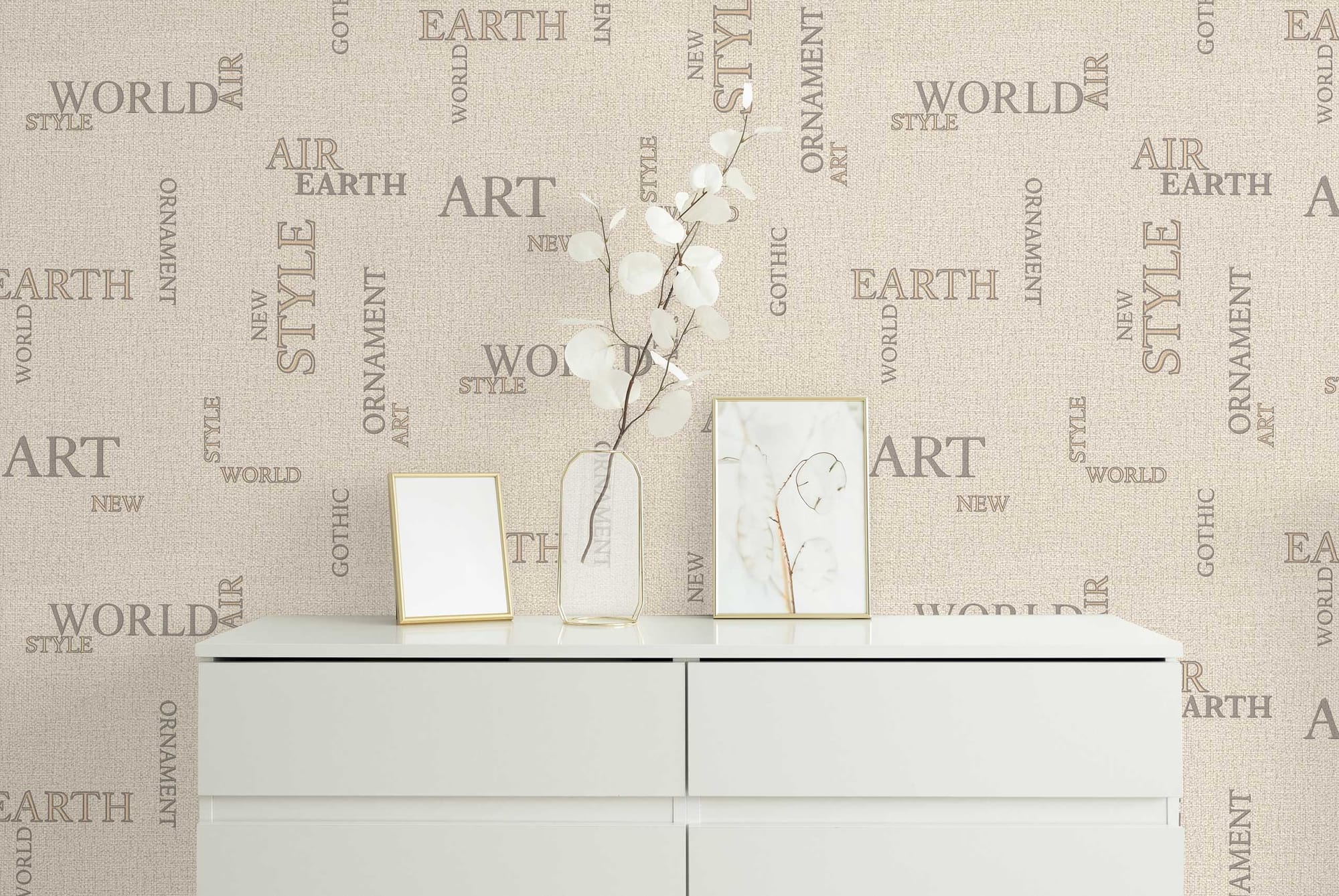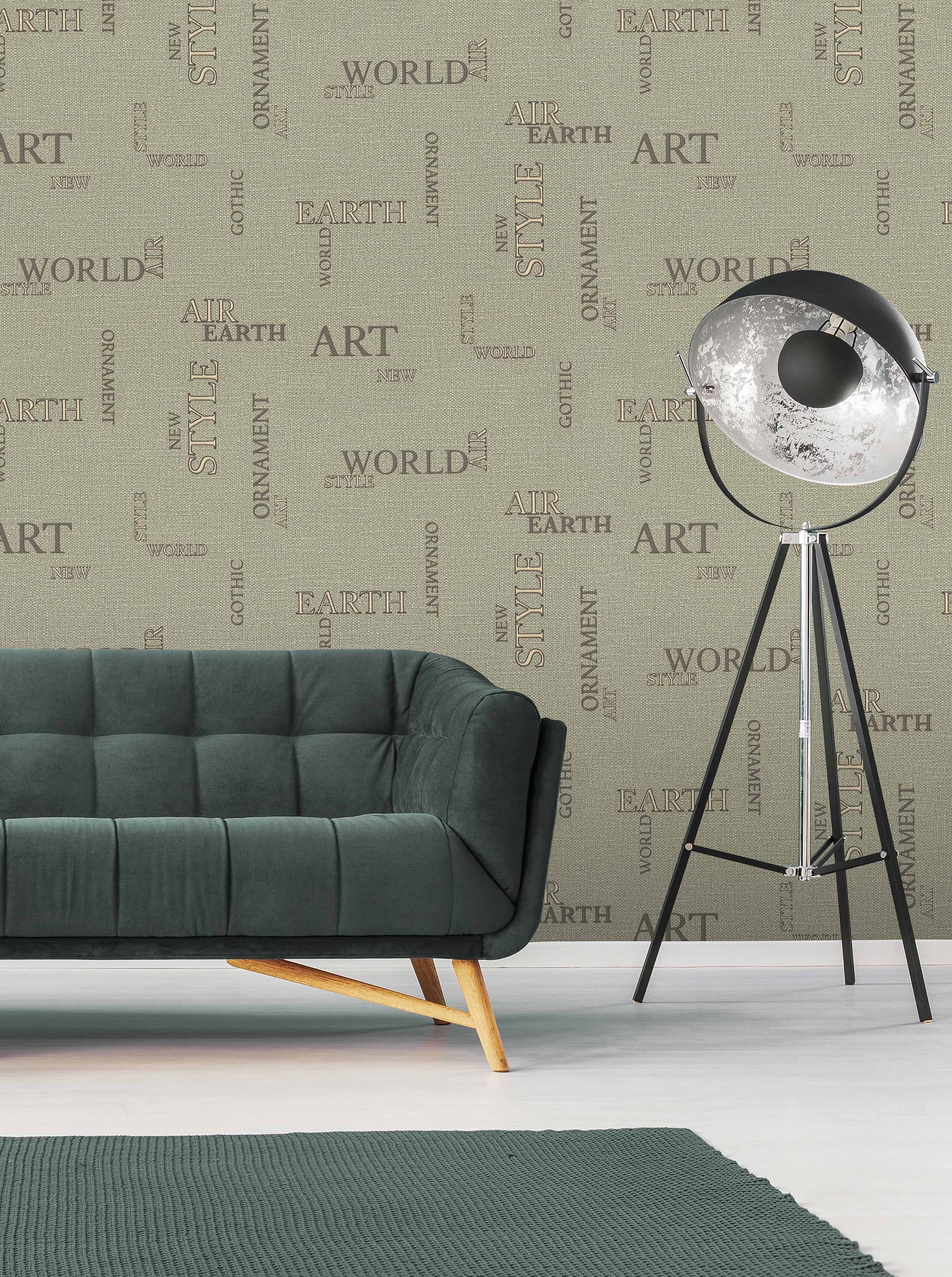 Коллекция обоев «Letters» — это воплощение современного дизайна, в котором сочетаются лаконичность формы и выразительность текстуры. Название «Letters», которое переводится с английского языка как «буквы», выбрано не случайно: поверхность полотен украшена словами — EARTH, WORLD, AIR, STYLE, ORNAMENT, ART, NEW, GOTHIC — символами гармонии природы и творчества, земли и воздуха, стабильности и вдохновения. Эти слова словно парят на мягком текстильном фоне, создавая ощущение пространственной динамики. Буквы выполнены в утонченном классическом шрифте разных размеров: одни становятся акцентом композиции, другие — дополняют ее. Акцентные очертания букв выделены золотистым и серебристым металликом с темным контрастным контуром, благодаря чему они переливаются при смене угла зрения или освещения.