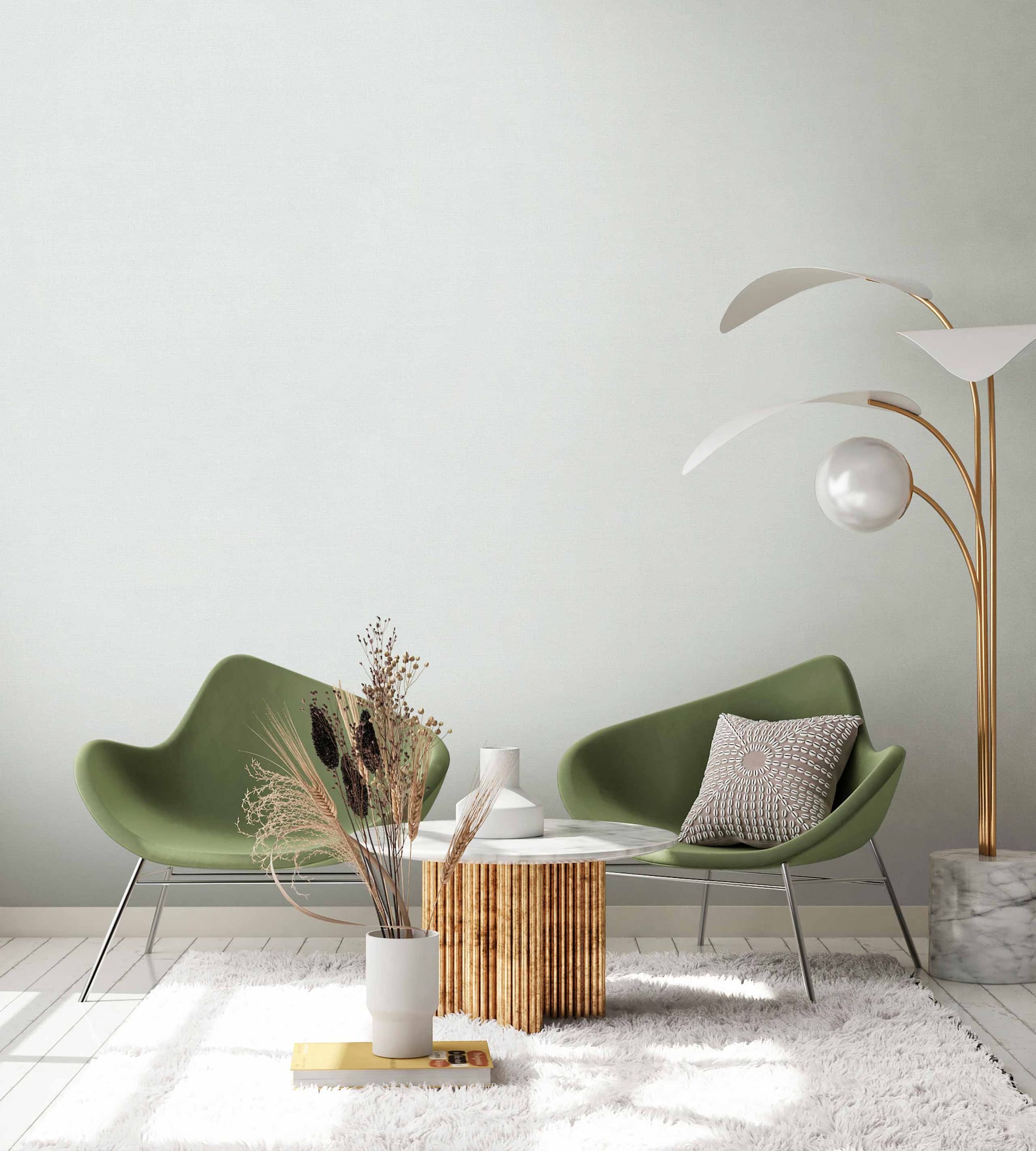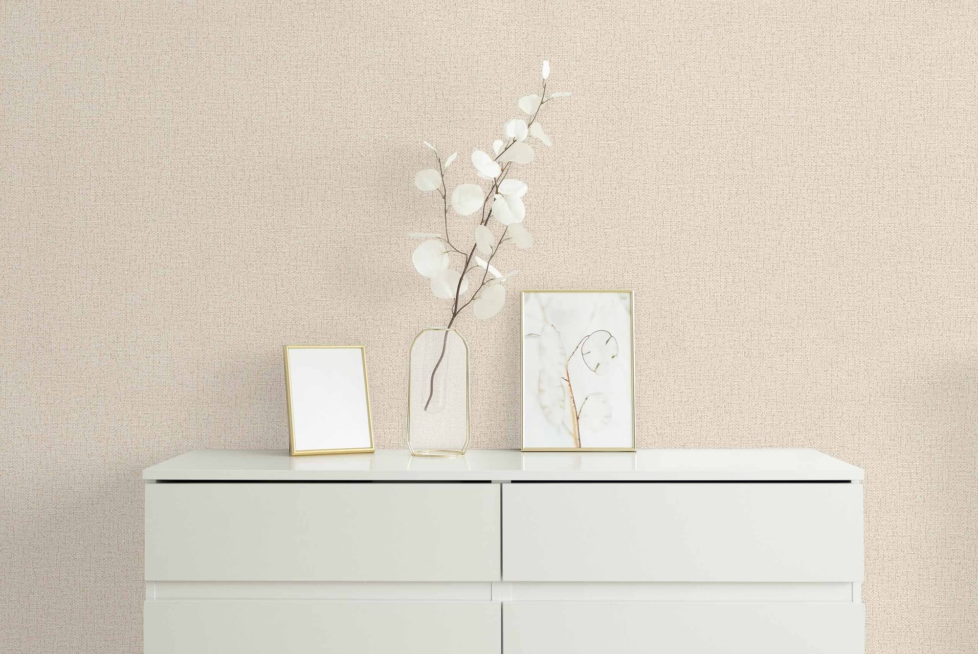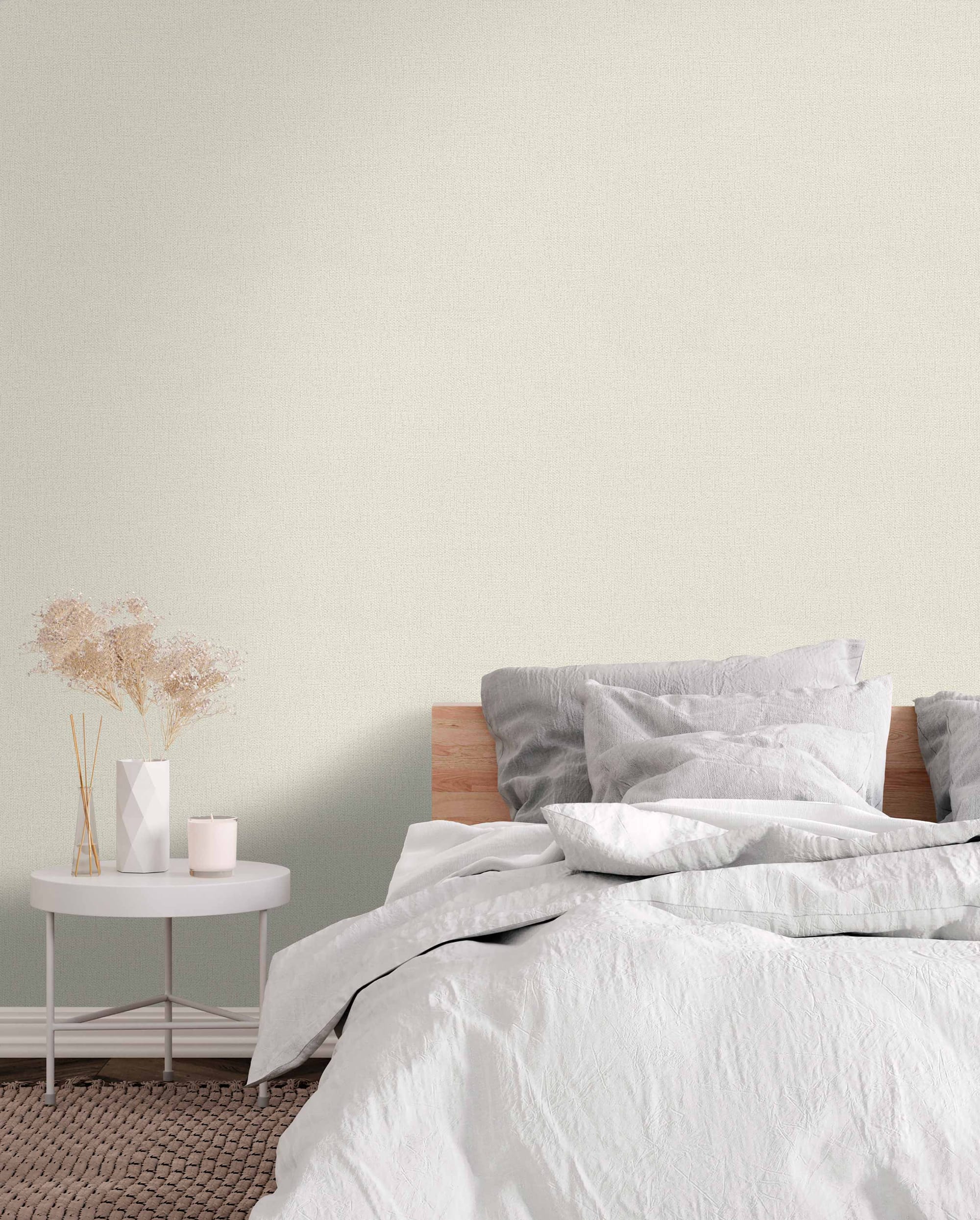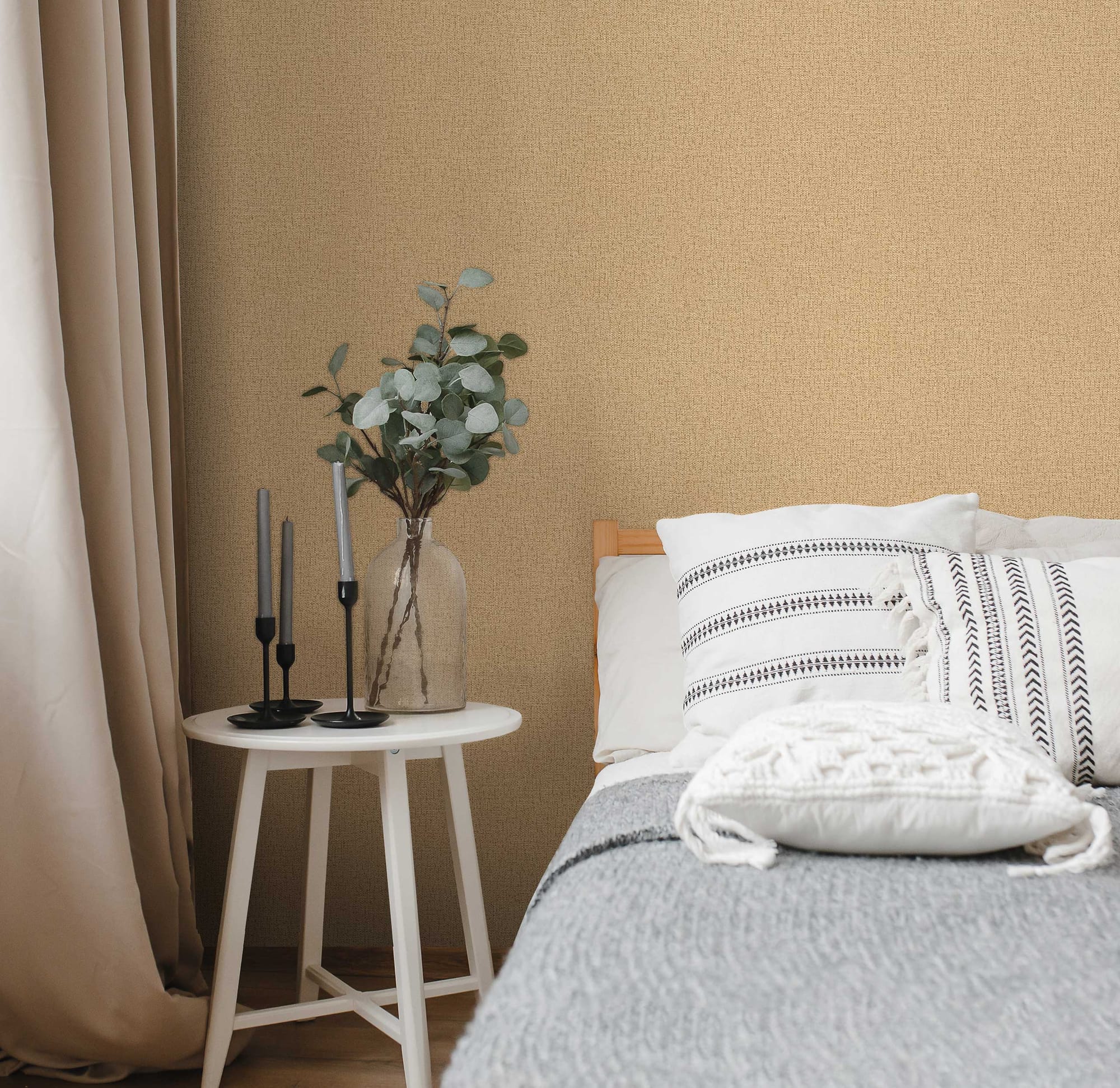 Фактура полотен имитирует текстильную ткань и напоминает тонко сотканное полотно из натуральных нитей. На ощупь материал приятен — с лёгкой шероховатостью и деликатным рельефом, создающим ощущение уюта и тактильности. Под различным освещением поверхность раскрывается по-разному: днём она выглядит матовой и спокойной, а в вечернем свете буквы мягко отражают лучи, добавляя композиции глубину и визуальный объём. Такой текстильный эффект придаёт стенам благородный вид.