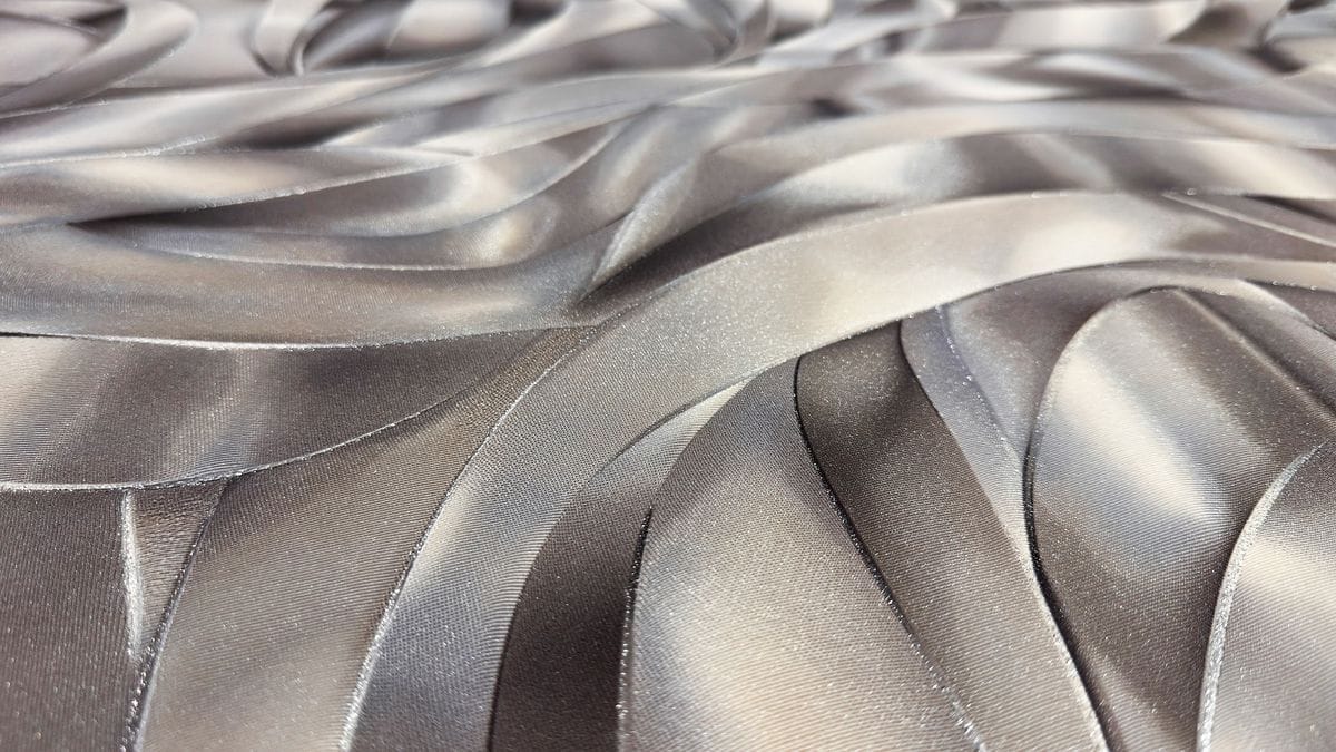 Ленты словно находятся в движении — они текут по поверхности полотна, создавая ощущение глубины, легкости и визуальной динамики. Фактура полотен имитирует тонкий шелк с сатиновым блеском. Поверхность гладкая, с едва ощутимым свечением, которое подчёркивает форму лент и делает их визуально объемными.
