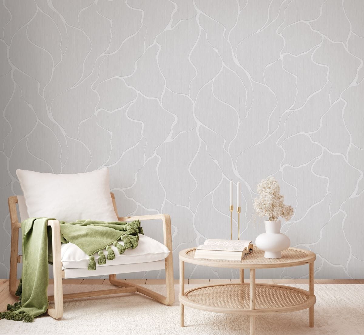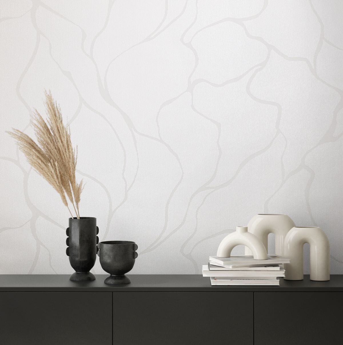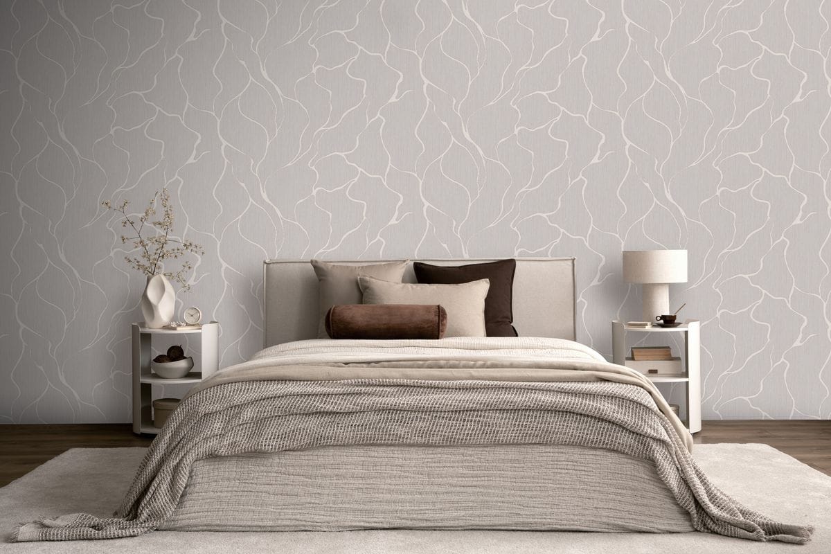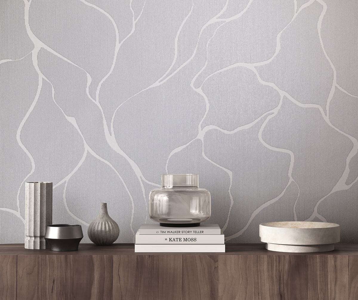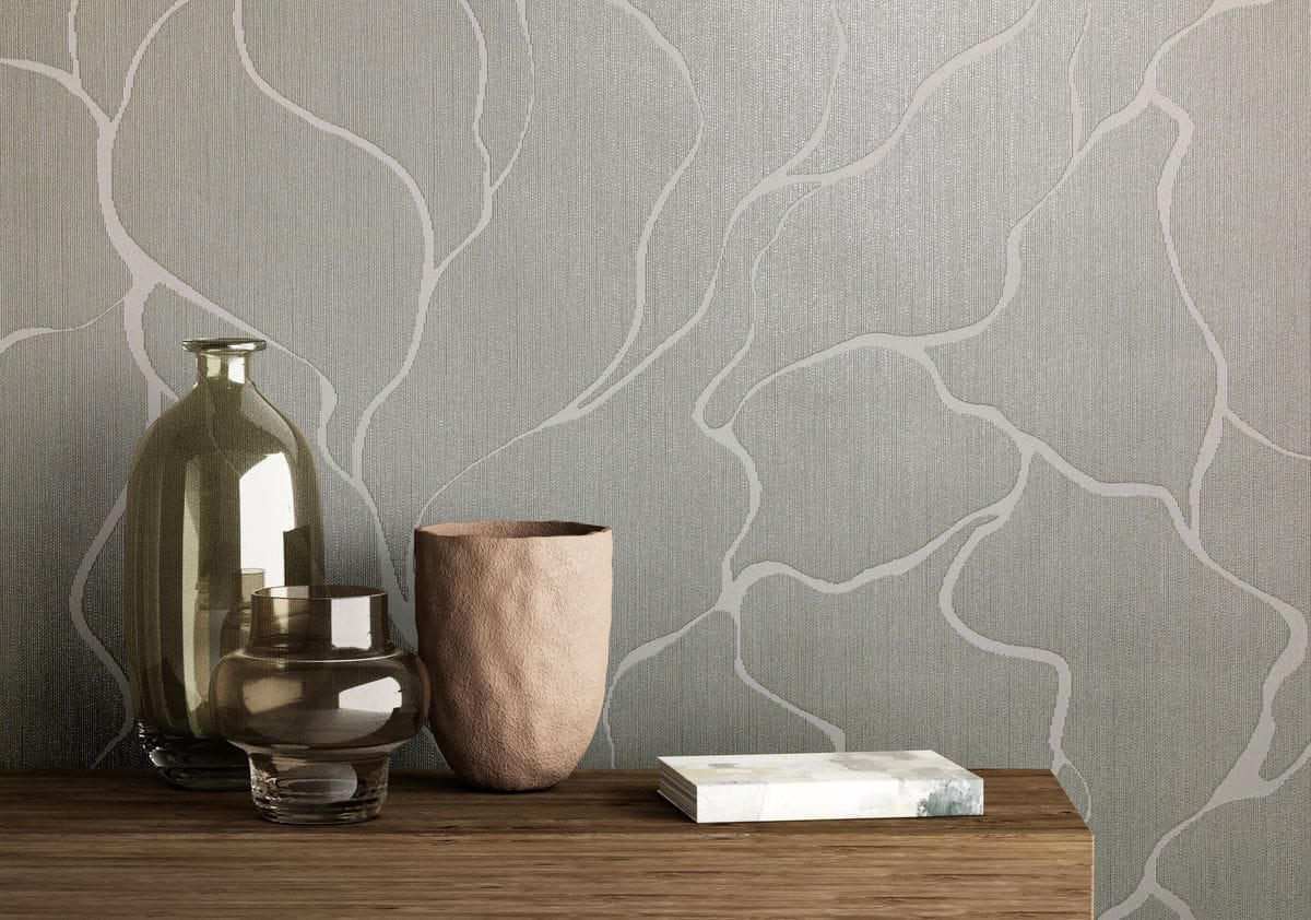 Плавные, органичные линии, напоминающие природные формы, создают динамику без визуальной перегруженности. Беспроигрышное сочетание гладких и текстильных фактур, матовых и мерцающих элементов добавляет интерьеру глубину и ощущение премиальности. Такое сочетание усиливает объем рисунка и подчёркивает его рельеф, делая стены визуально интересными и многослойными.