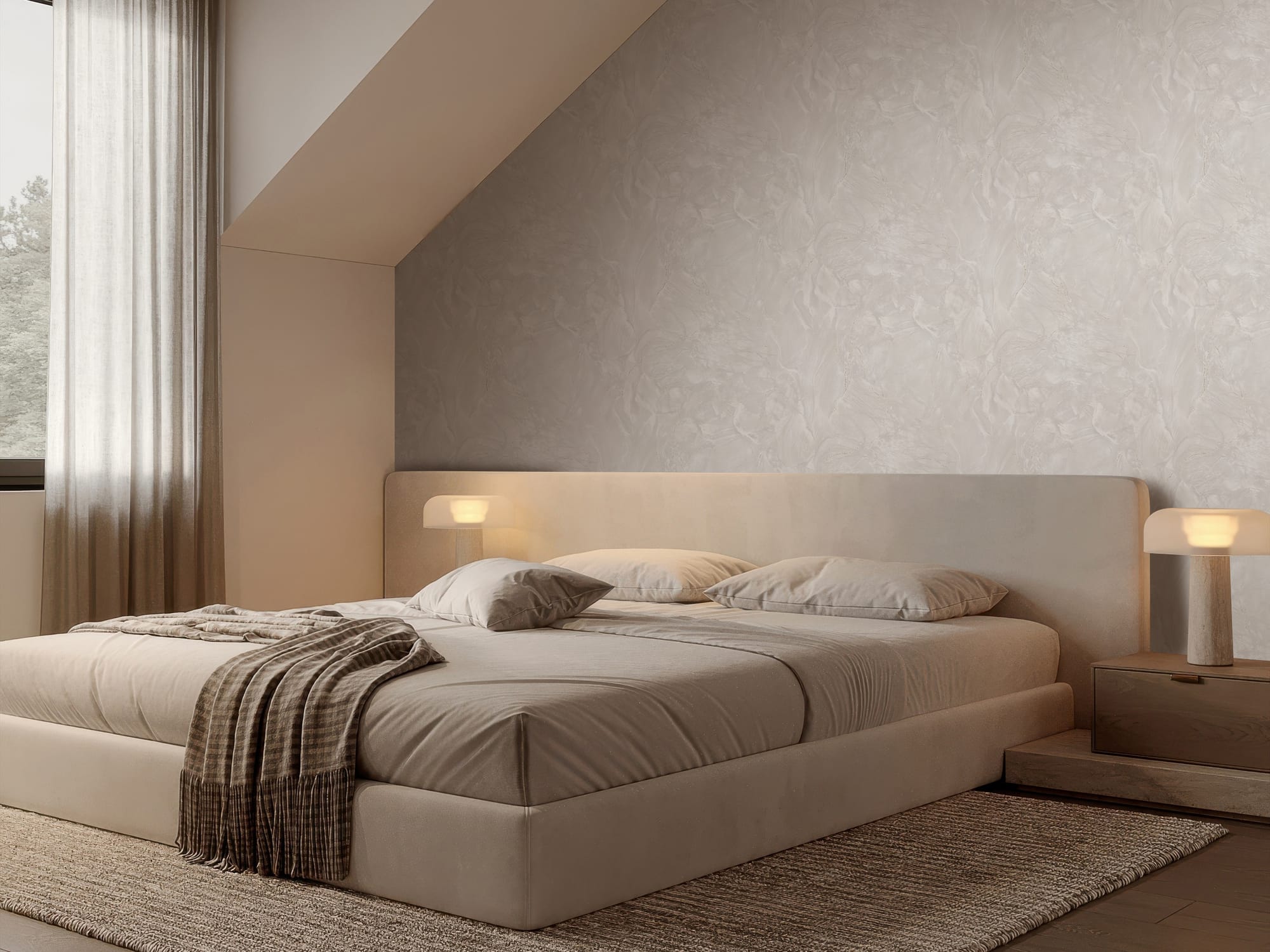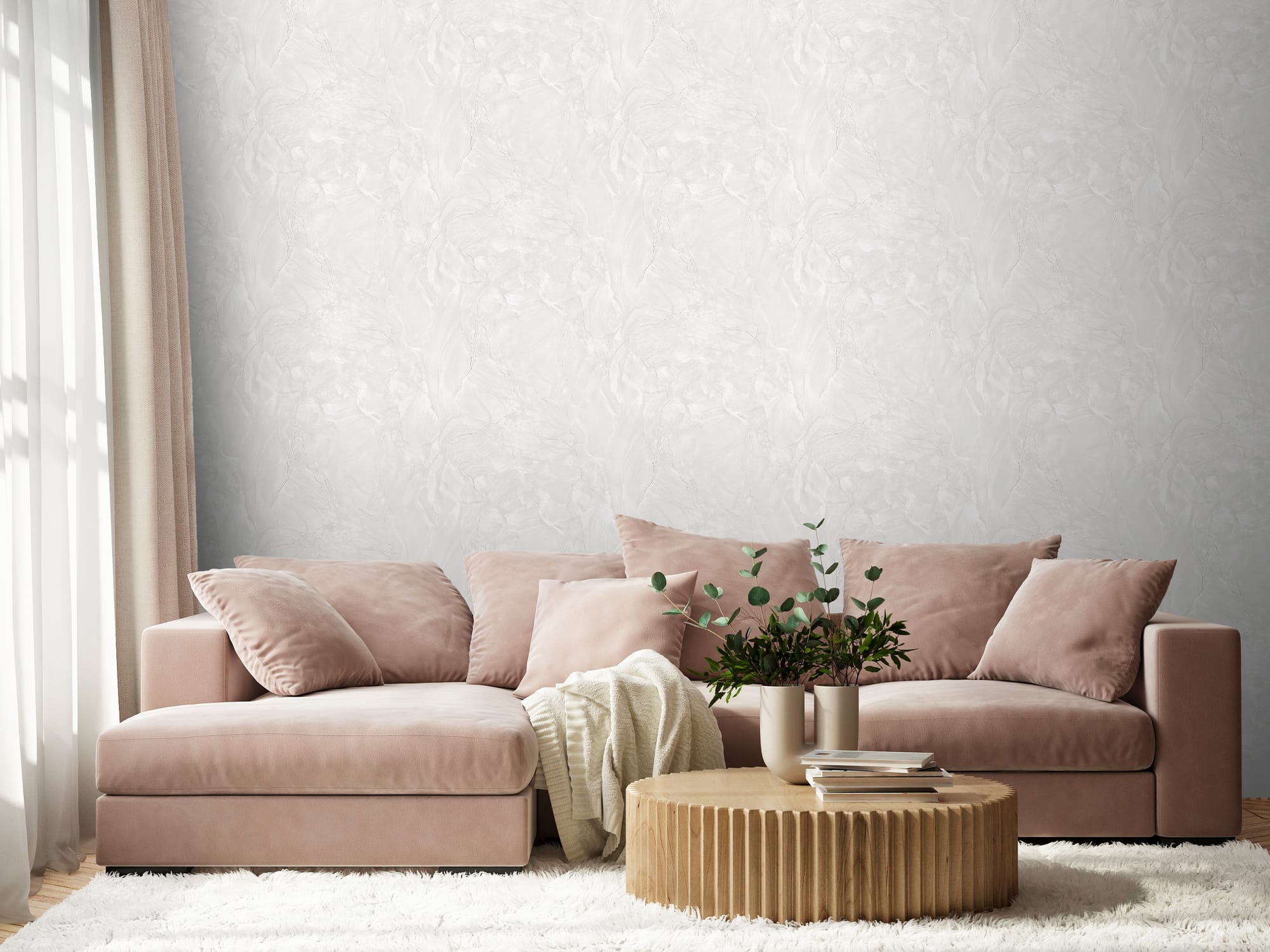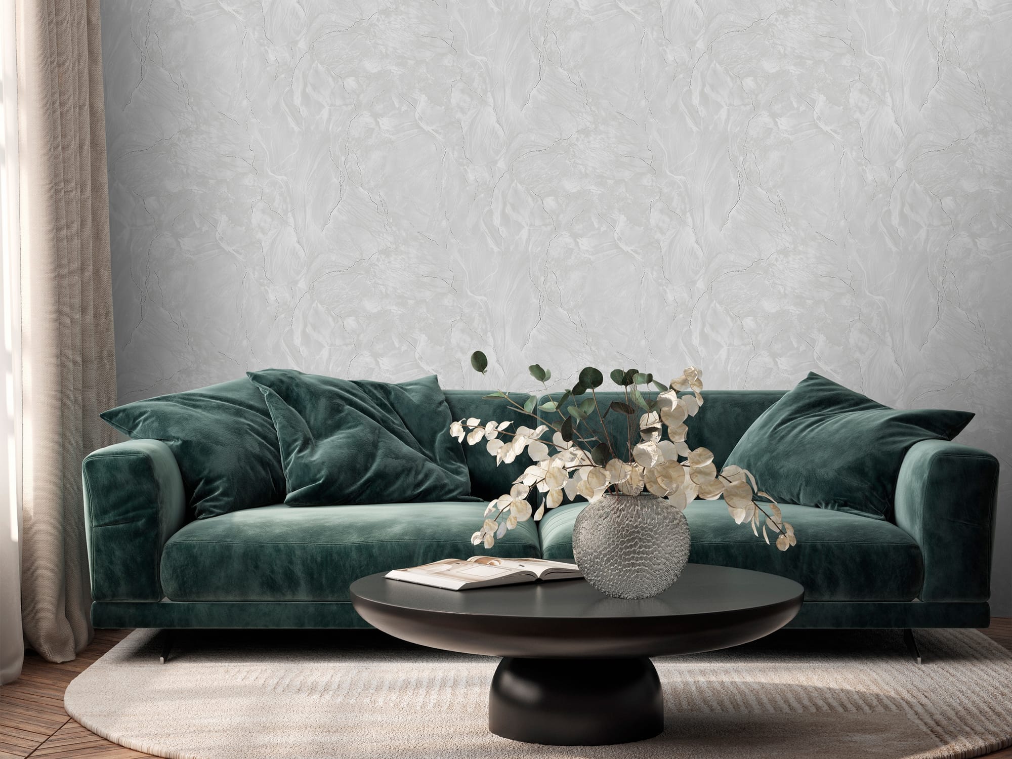 Природный каменный узор с изящными прожилками и глубокой фактурой превращает стены в монументальное произведение искусства. Деликатное сияние перламутра, вплетенное в структуру полотна, придает стенам объем и игру света.