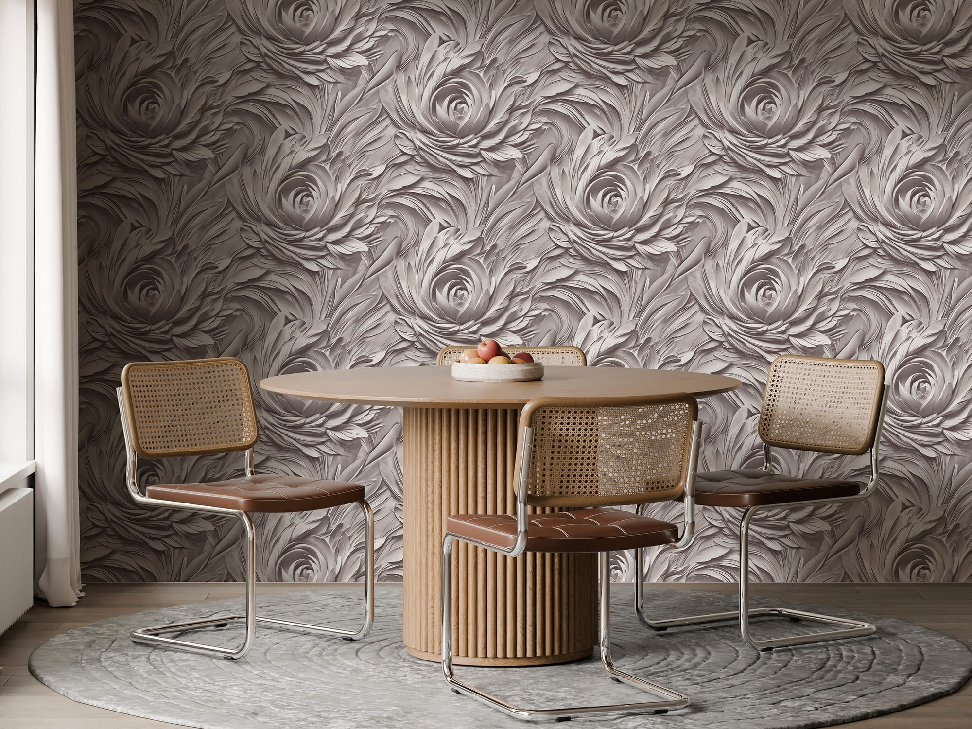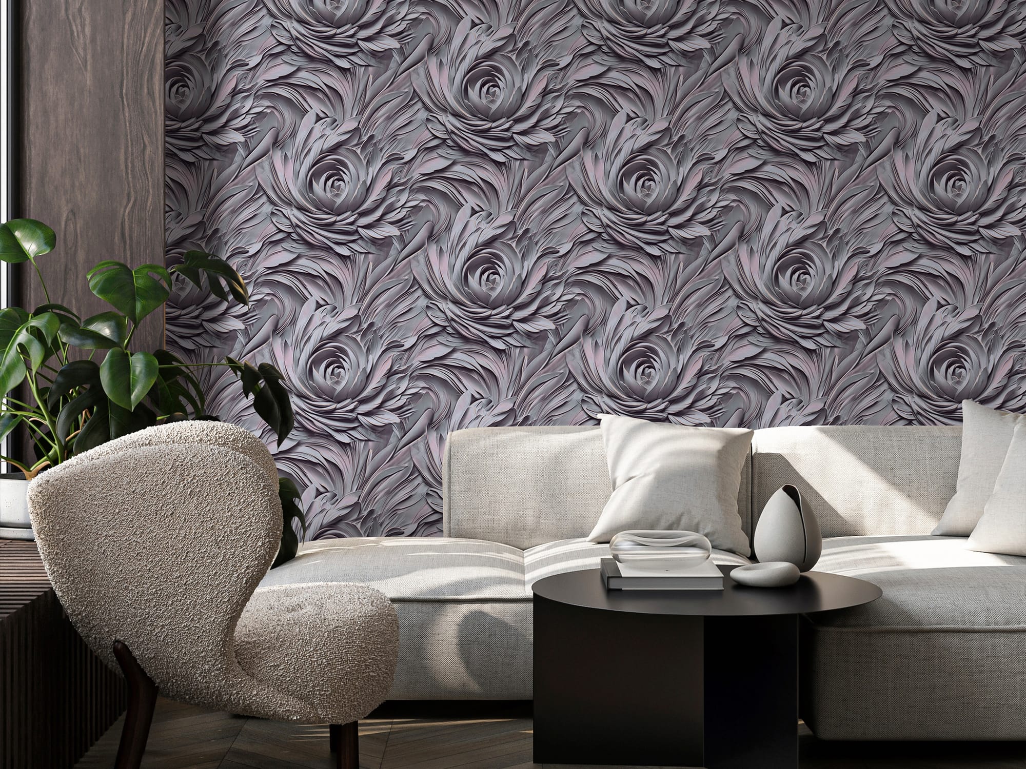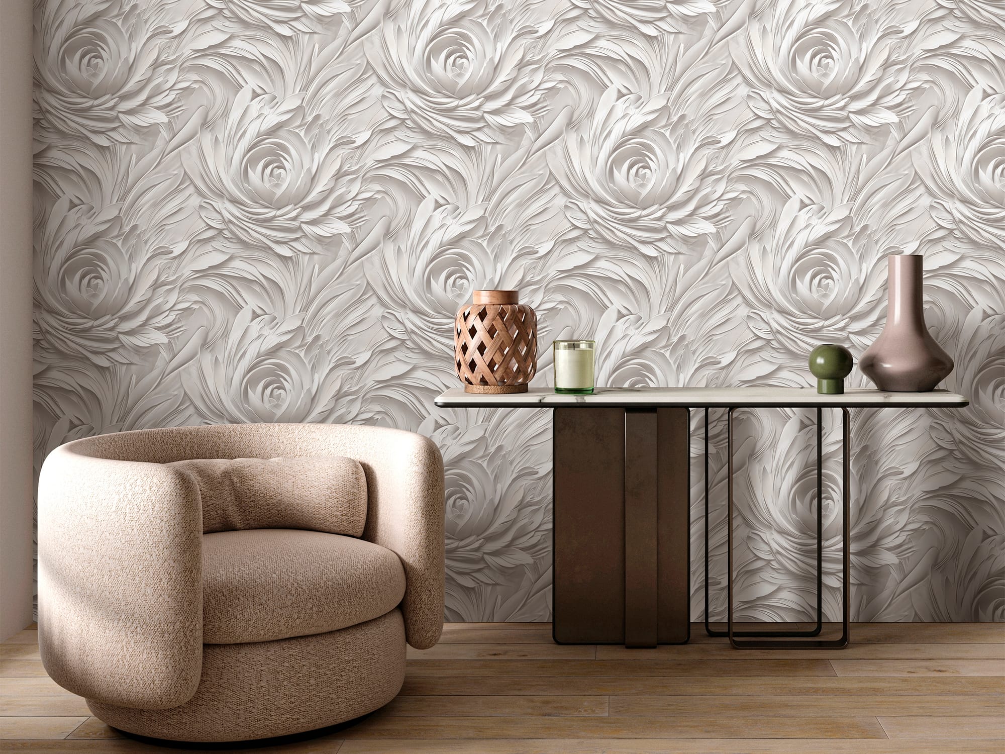 Каждый элемент тщательно выполнен: проработанные детали и потрясающий объем создают впечатление настоящего барельефа на стене. Матовая поверхность с деликатными переливами добавляет глубину, подчёркивает 3D объем и архитектурность рисунка. Свет и тень играют на фактуре, превращая стены в произведение декоративного искусства.