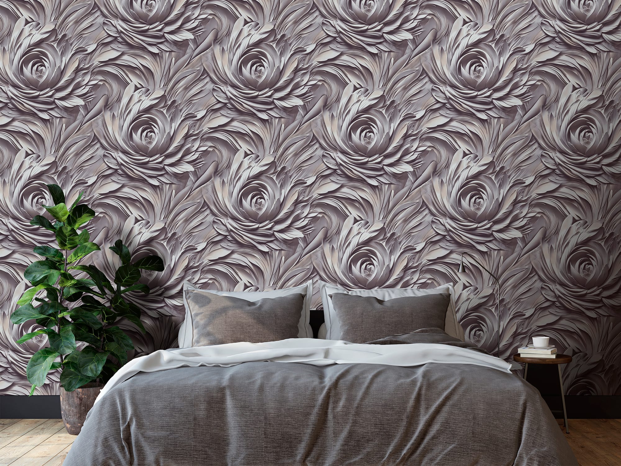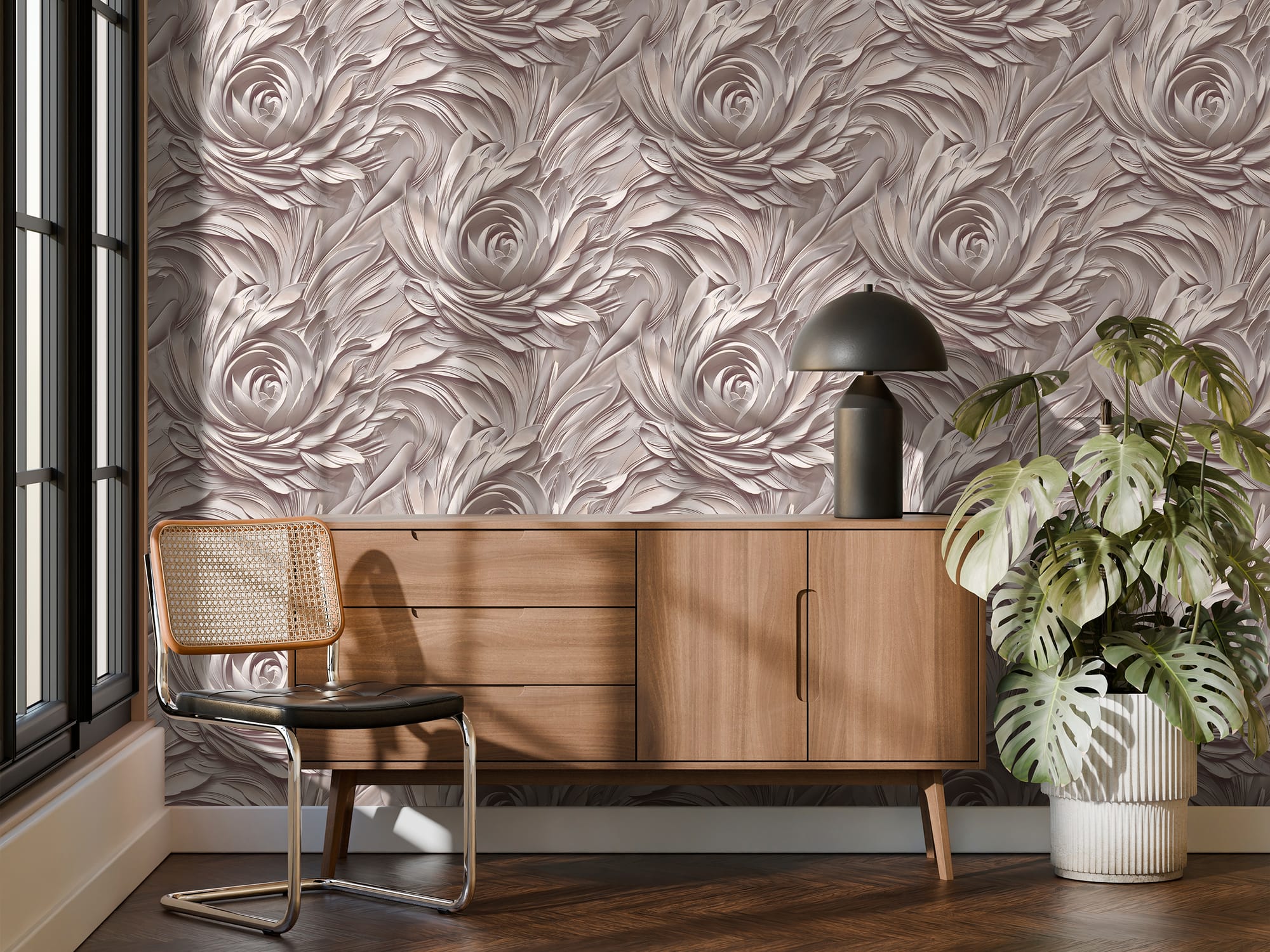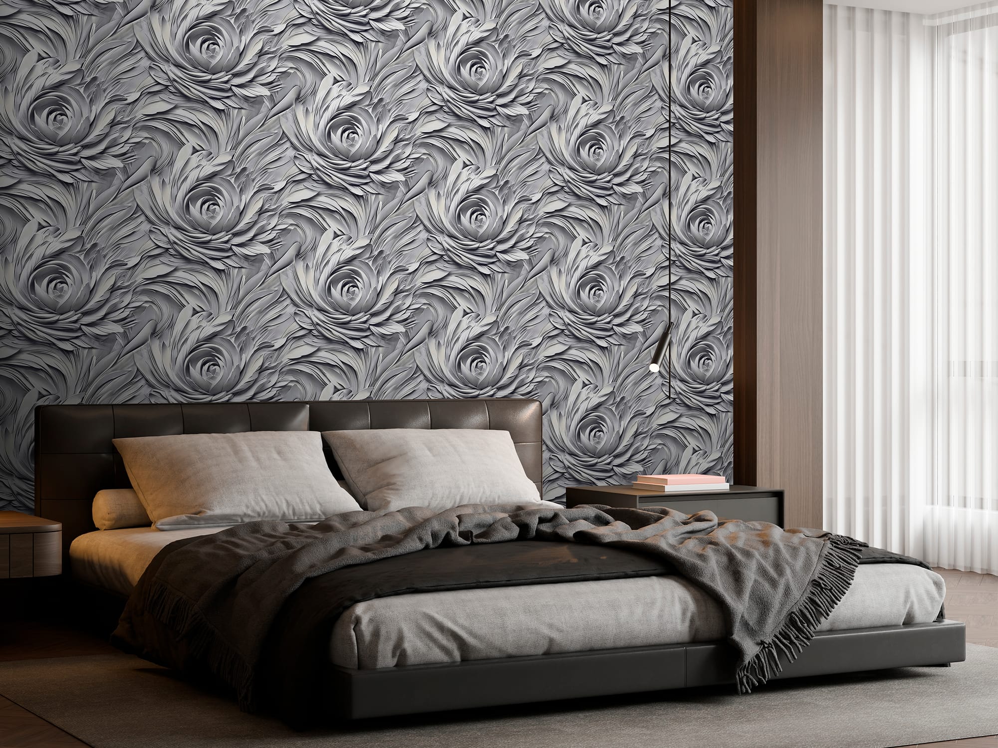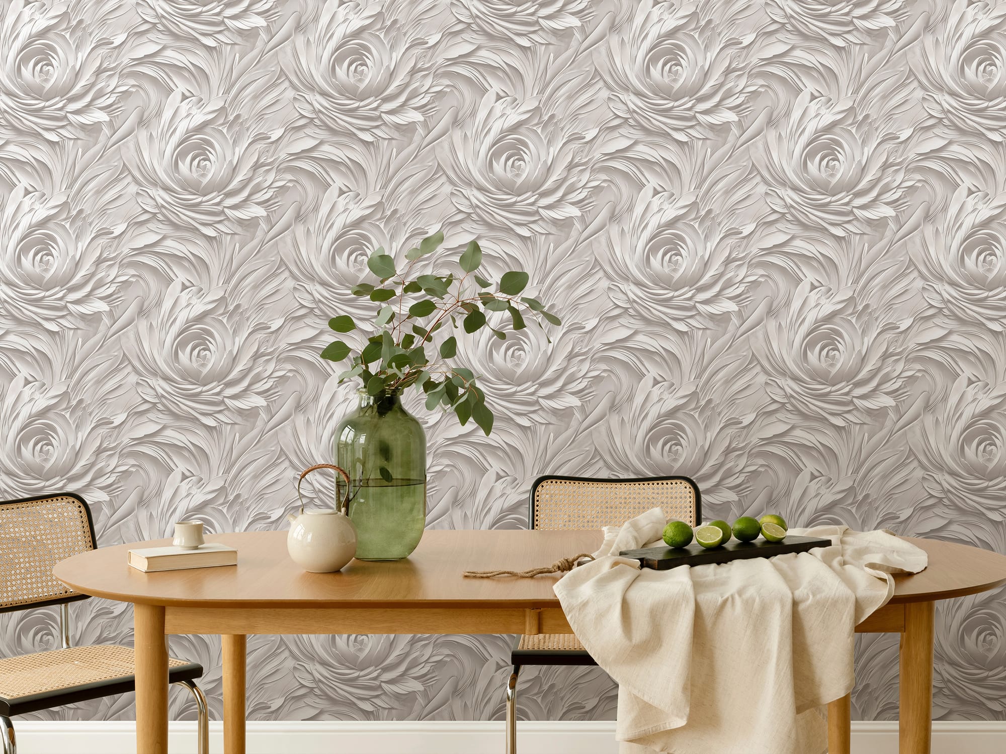 Каждый элемент тщательно выполнен: проработанные детали и потрясающий объем создают впечатление настоящего барельефа на стене. Матовая поверхность с деликатными переливами добавляет глубину, подчёркивает 3D объем и архитектурность рисунка. Свет и тень играют на фактуре, превращая стены в произведение декоративного искусства.
