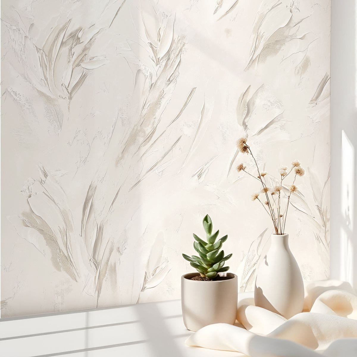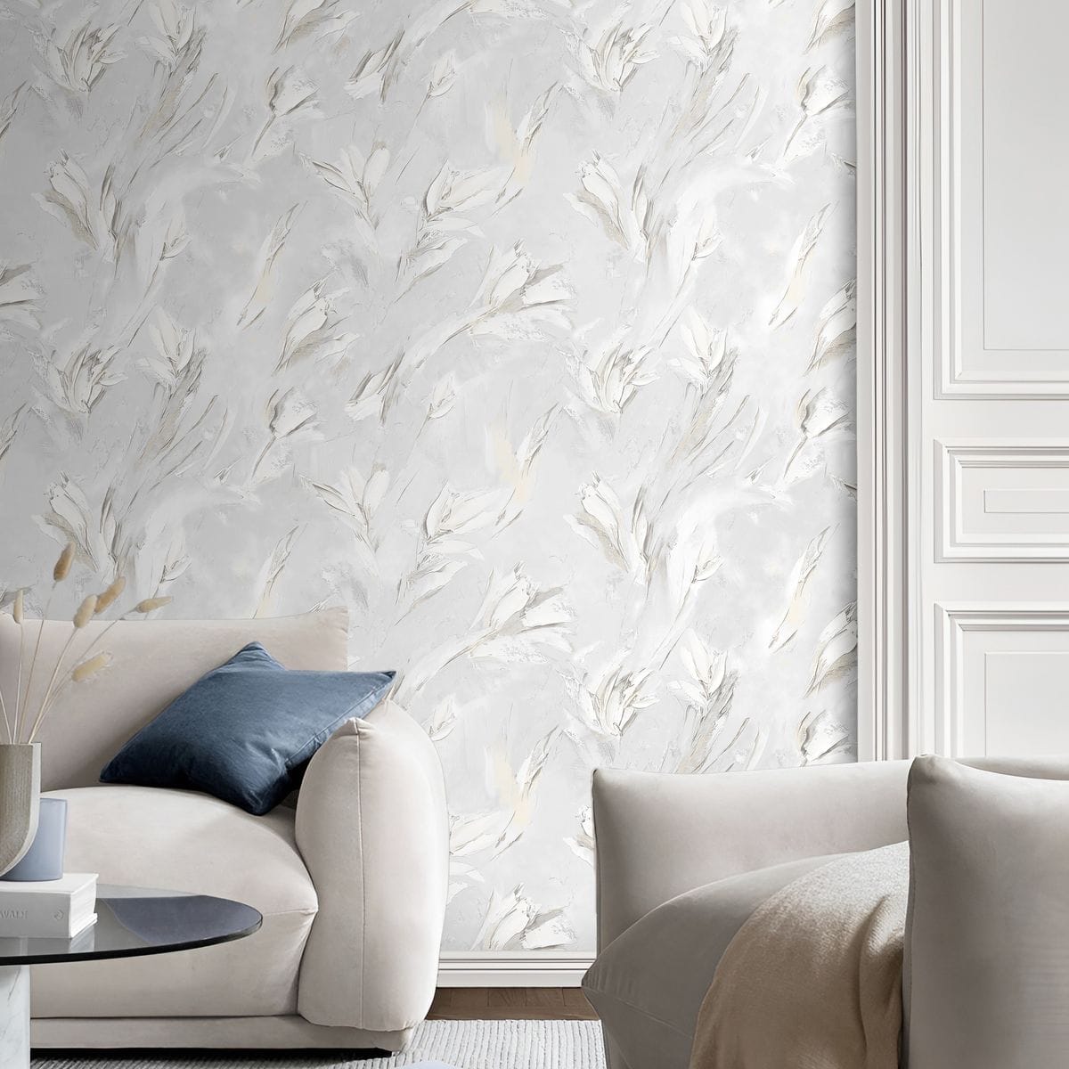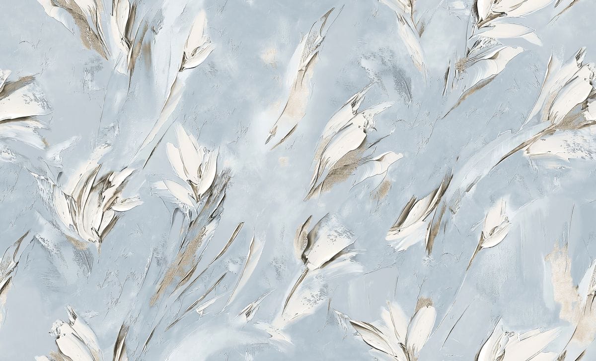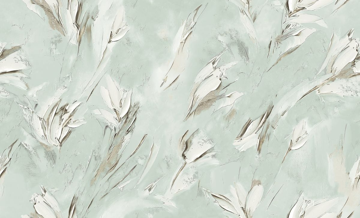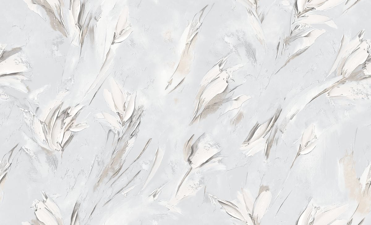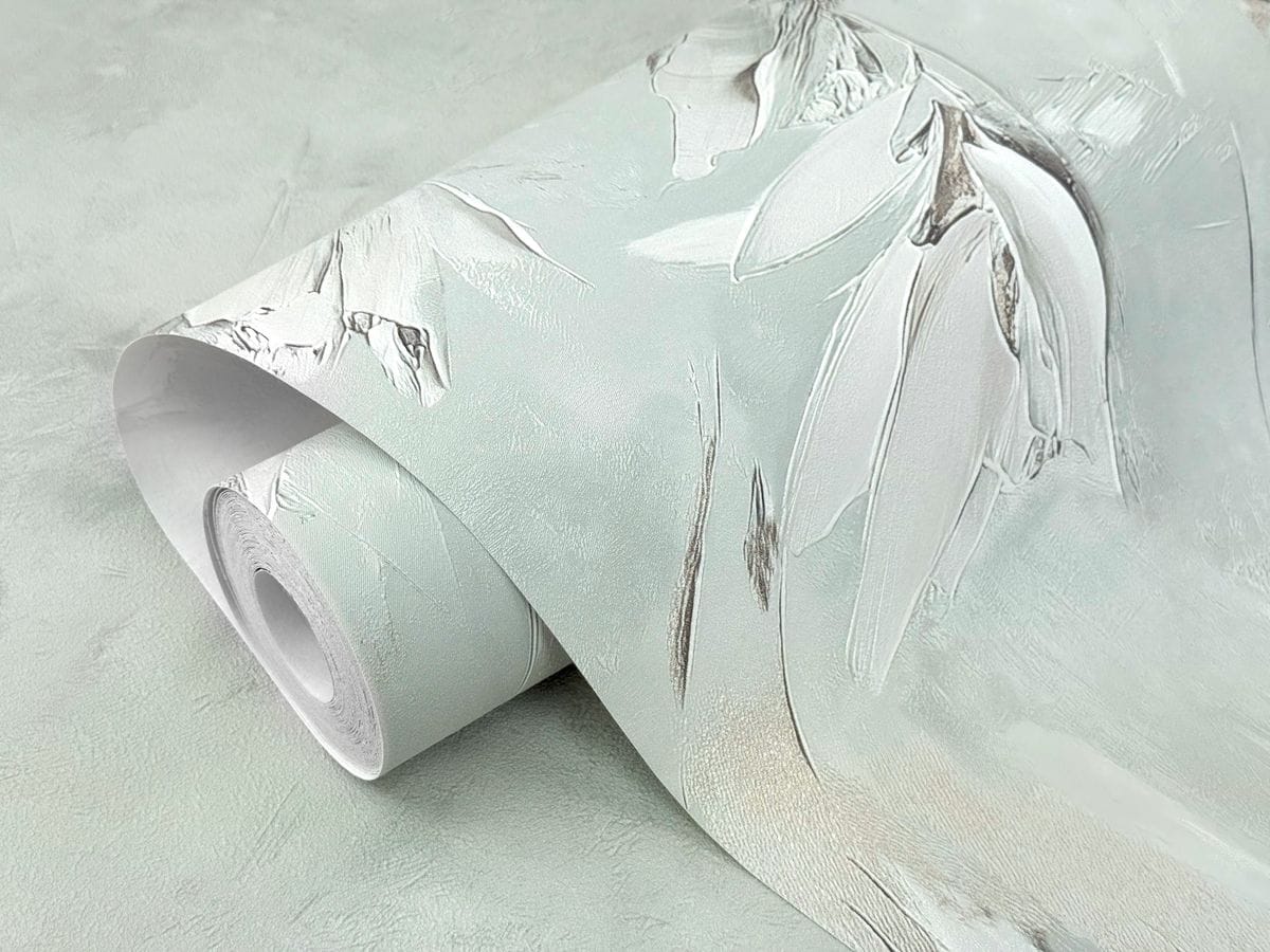 Абстрактный мотив напоминает очертания цветов, выполненных в оригинальной манере. Сияющий тонкий шиммер и эффекты металлик совместно с тиснением подчеркивают контуры рисунка, делая его еще более реалистичным.