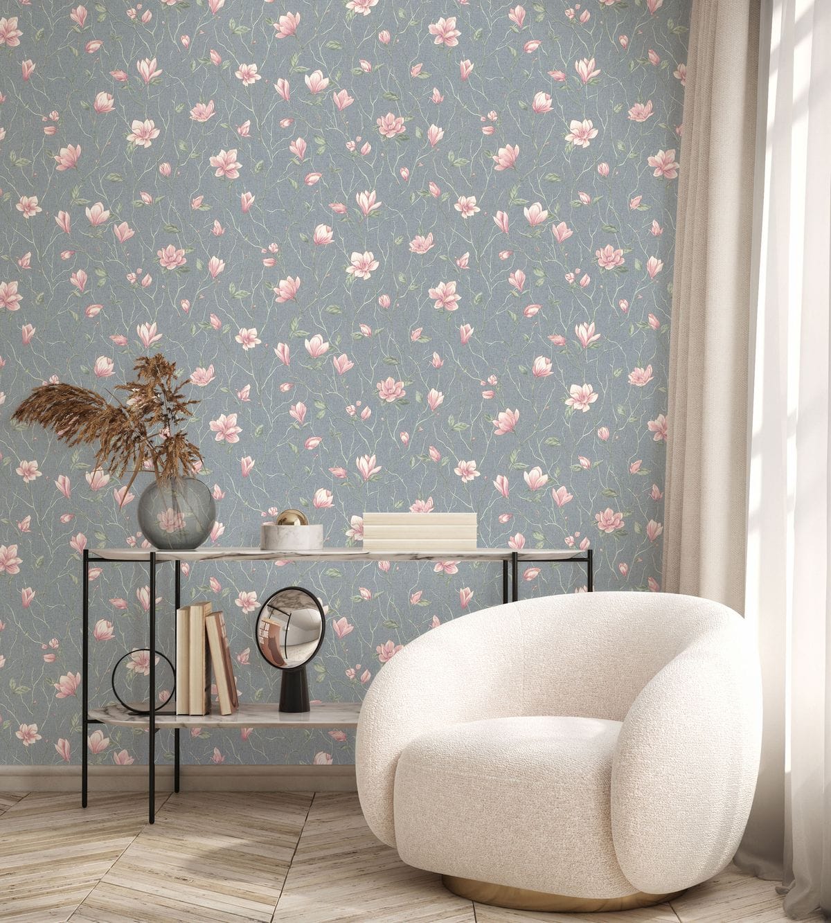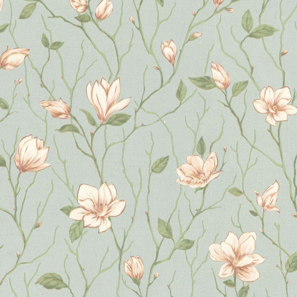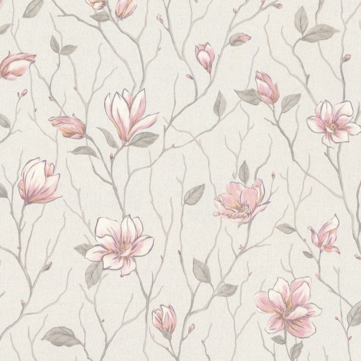 Коллекция обоев «Магнолия» названа в честь утонченного цветка, который в китайской культуре символизирует чистоту, весну и гармонию природы. Такое название идеально отражает суть коллекции и ее нежный, но выразительный цветочный узор, который привносит в интерьер ощущение спокойствия и грации. Мотив коллекции представляет собой рисунок из аккуратных ветвей магнолии с цветущими бутонами. Цветы проработаны с тонкой детализацией: лепестки мягко изогнуты, образуя чашевидную форму с утонченными тычинками.