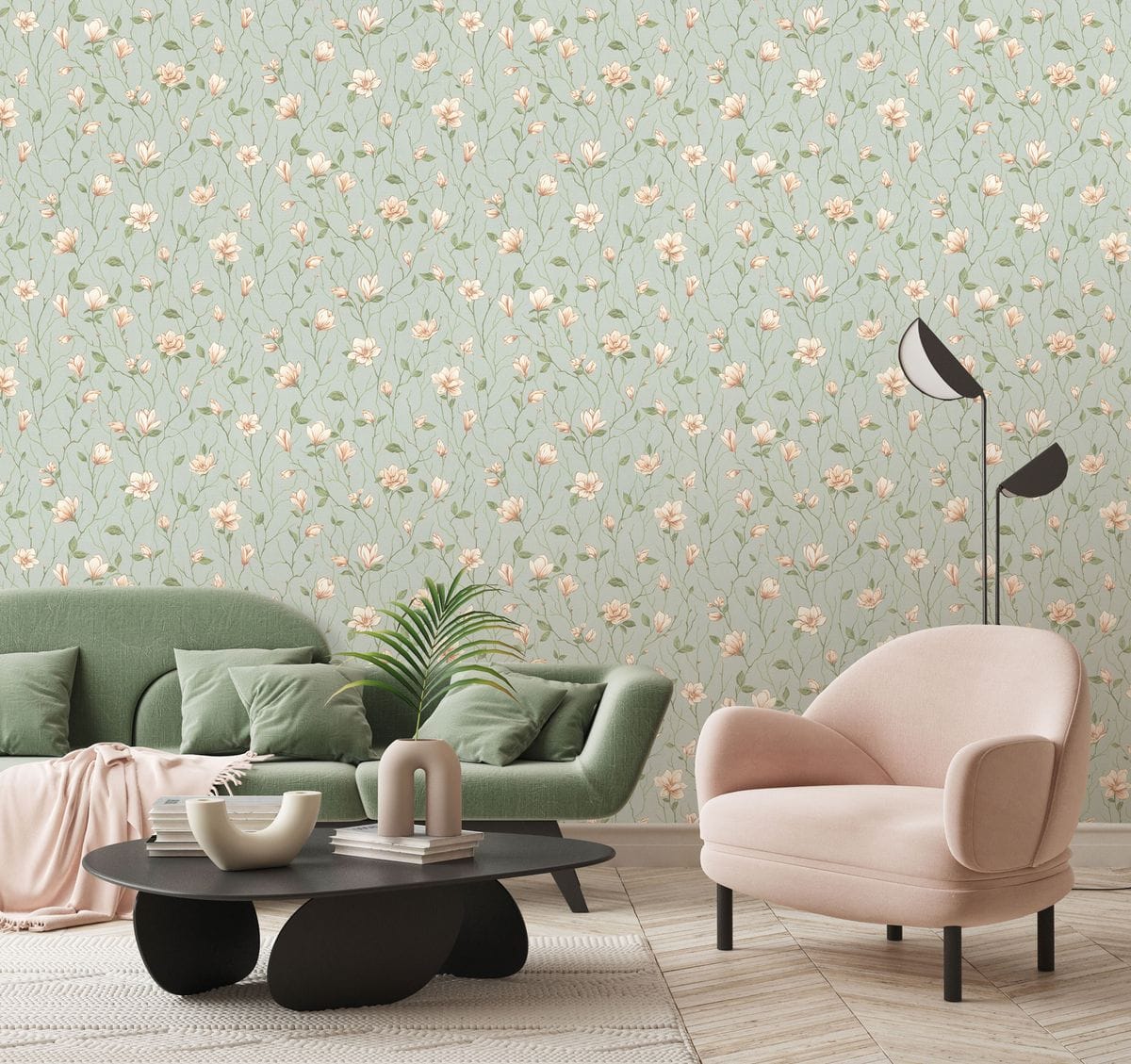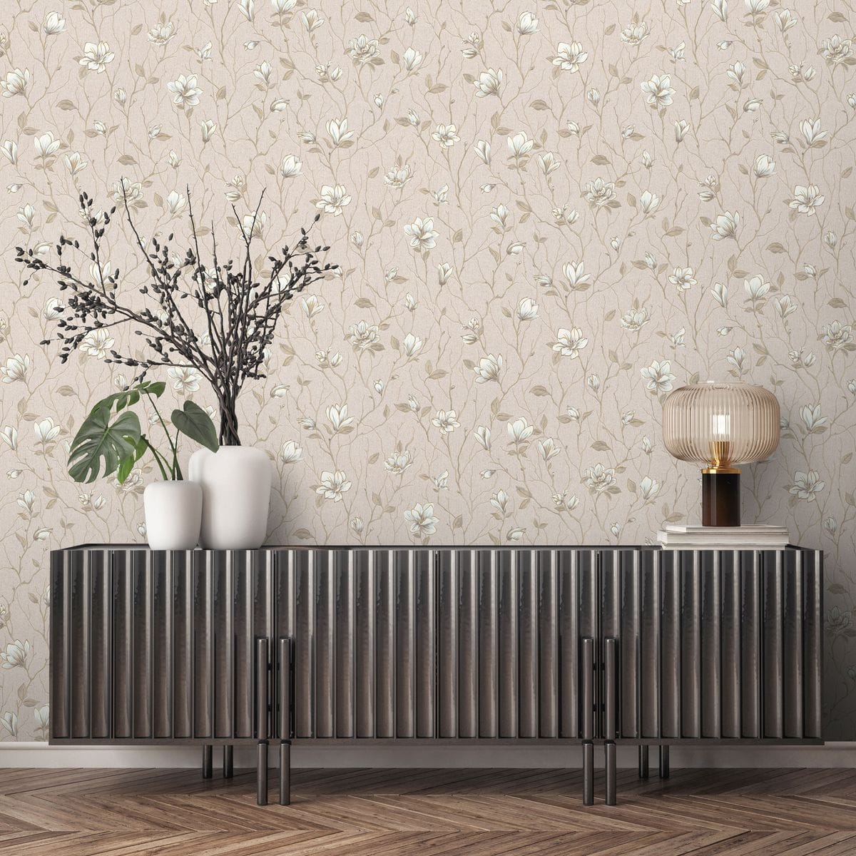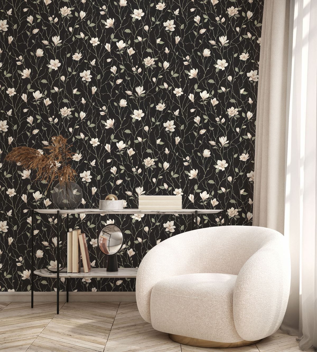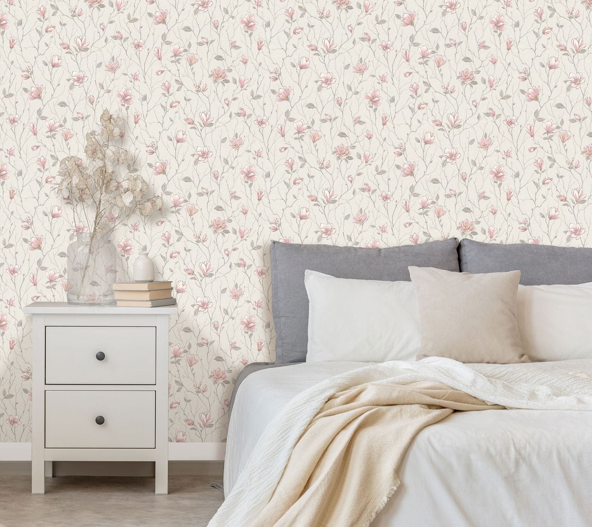 Коллекция обоев «Магнолия» названа в честь утонченного цветка, который в китайской культуре символизирует чистоту, весну и гармонию природы. Такое название идеально отражает суть коллекции и ее нежный, но выразительный цветочный узор, который привносит в интерьер ощущение спокойствия и грации. Мотив коллекции представляет собой рисунок из аккуратных ветвей магнолии с цветущими бутонами. Цветы проработаны с тонкой детализацией: лепестки мягко изогнуты, образуя чашевидную форму с утонченными тычинками.