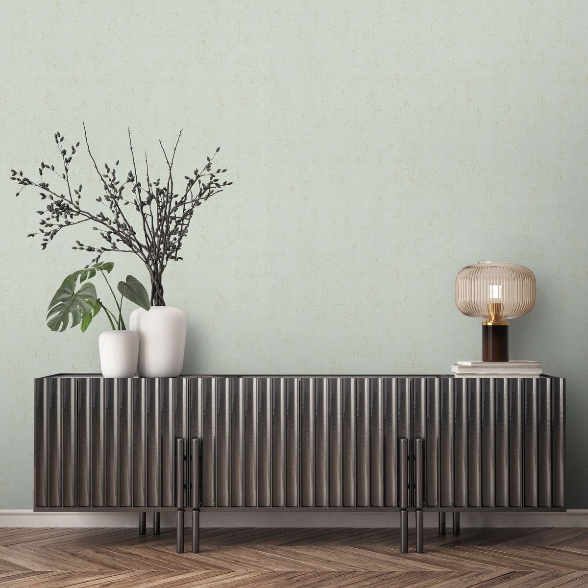 Орнамент выполнен в романтическом стиле, близком к акварельной живописи или современному шиносери с плавными, тонкими и воздушными линиями, которые создают естественный ритм. Фактура обоев имитирует текстиль — бархатистую ткань с мягким рельефом, который усиливает тактильное восприятие, делая стены не просто фоном, а частью атмосферы комнаты. Особым акцентом служит сияющий глиттер, искусно нанесенный на лепестки и контуры цветов: он мерцает при свете, добавляя полотнам изысканный блеск, словно россыпь росы в цветущем саду. Цветовая палитра коллекции очень разнообразна. Она включает в себя как приглушенные, пастельные оттенки: молочный, кремовый, песочный и светло-бирюзовый, так и более насыщенные цвета: глубокий черный и холодный графитовый. Тона лепестков переходят от почти прозрачного белого к нежно-розовому или бежевому, а листья и стебли выполнены в светло-зеленых оттенках. Мотивы дополнены однотонными фонами, которые позволяют комбинировать флористический узор с минималистичными акцентами.