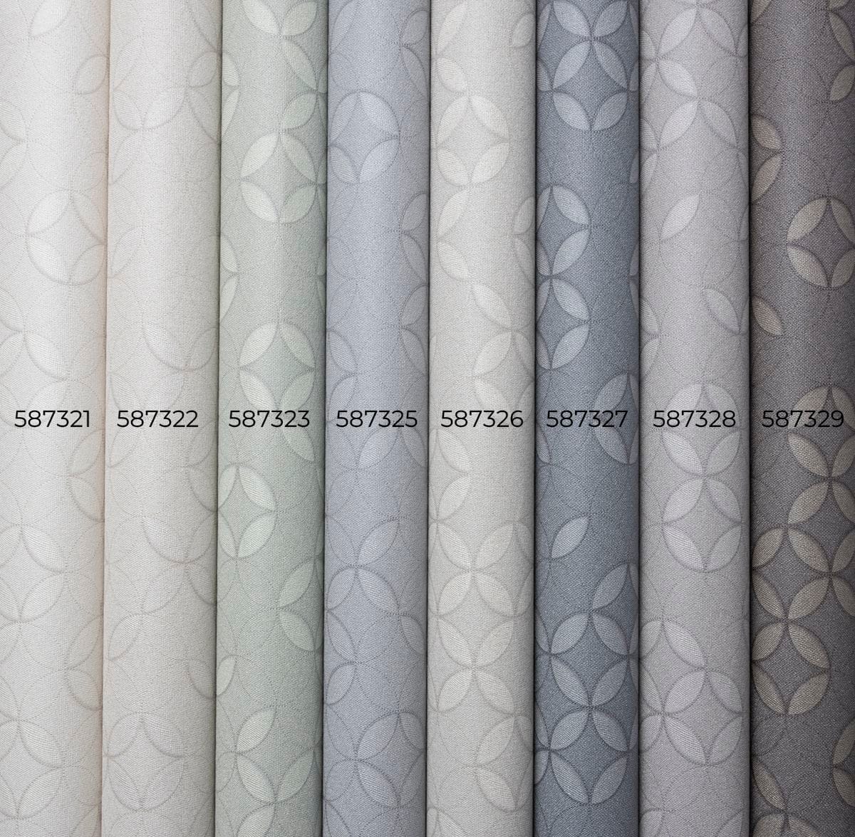 Особое очарование серии — в её текстильной основе. Лёгкая тканевая структура с «золотой» нитью придаёт покрытию мягкость восприятия и благородный характер. Свет мягко скользит по рельефу, подчёркивая геометрию и создавая эффект живой, дорогой поверхности.