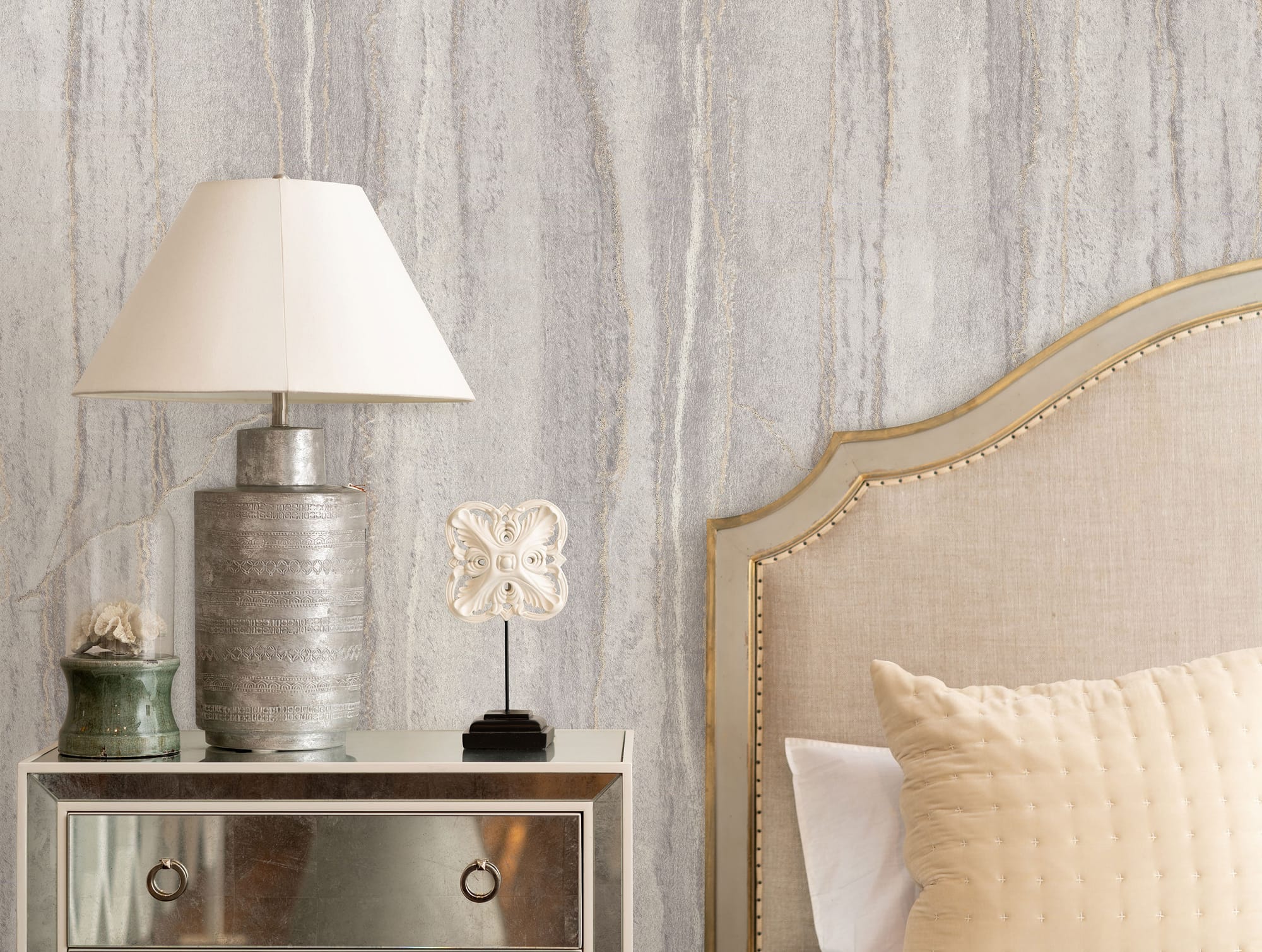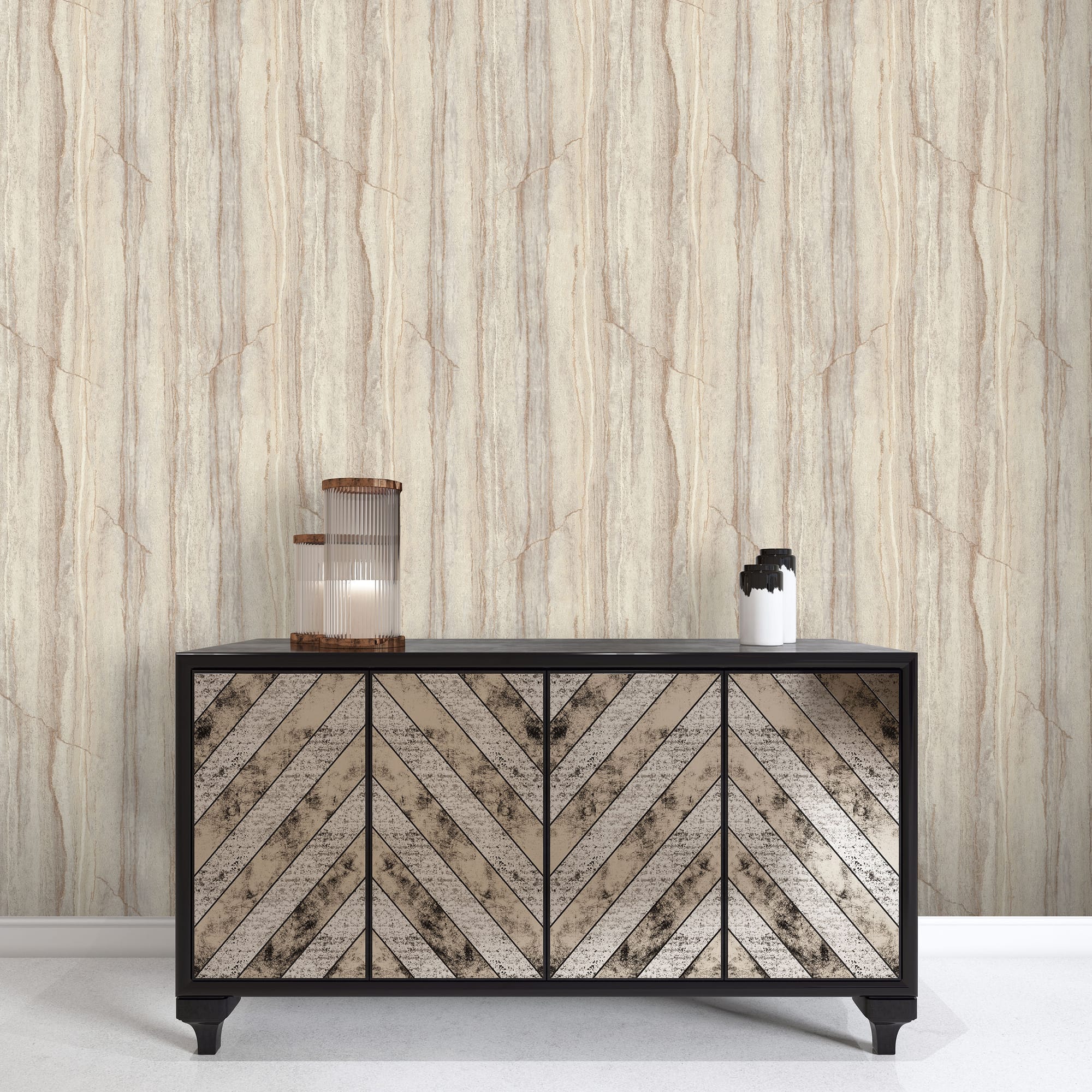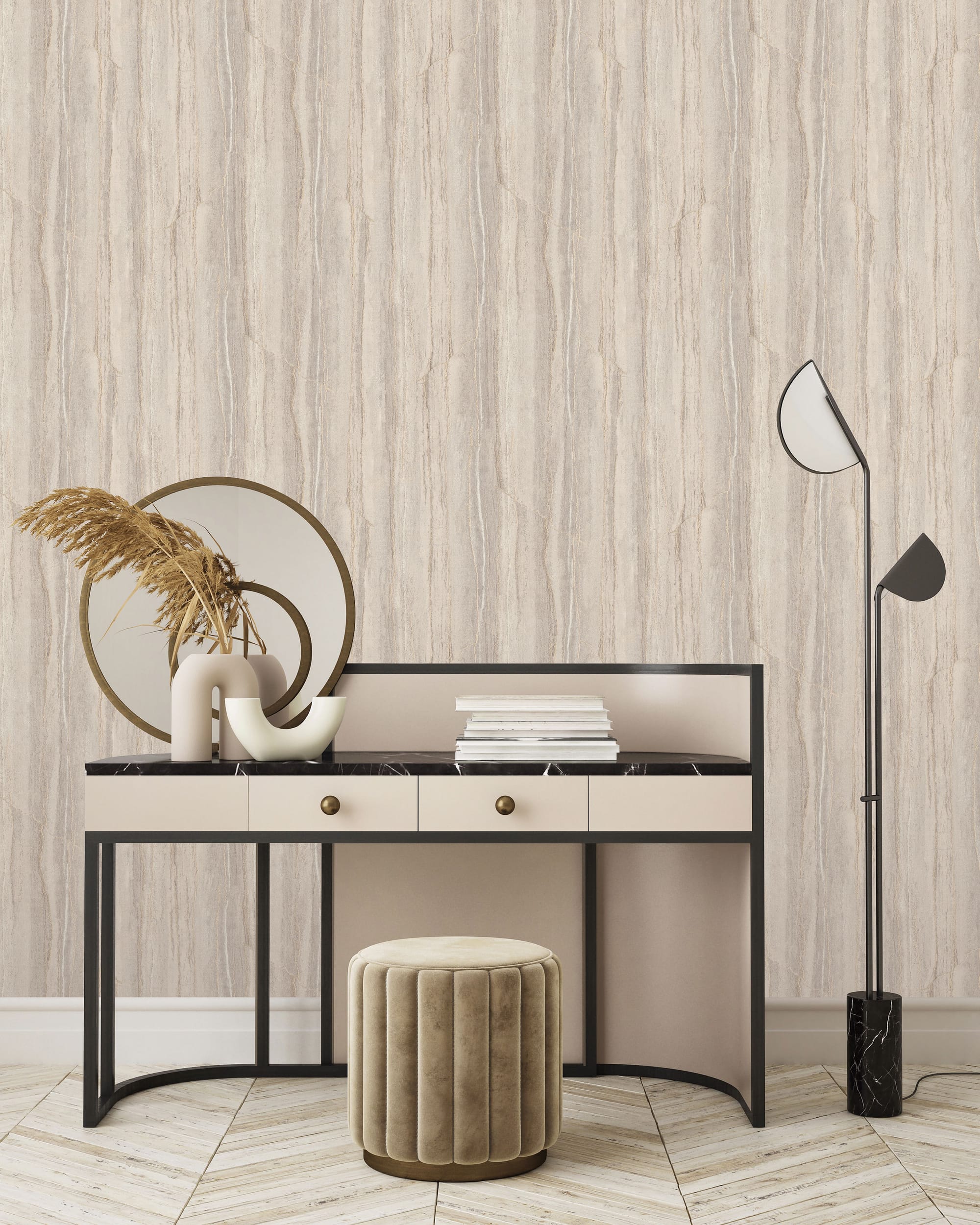 Коллекция обоев «Pietra», название которой переводится с итальянского как «камень», воплощает эстетику минеральной поверхности, в которой сочетаются природная сила и утончённость современного дизайна. Фактура полотен имитирует срез природного песчаника или слоистого известняка, где видны тонкие прожилки и мягкие переходы цвета. Эти линии создают ритмичную структуру, напоминающую каменные разломы и следы ветровой эрозии. Поверхность матовая, с бархатистым микрорельефом, передающим текстуру природного минерала настолько достоверно, что её хочется коснуться.