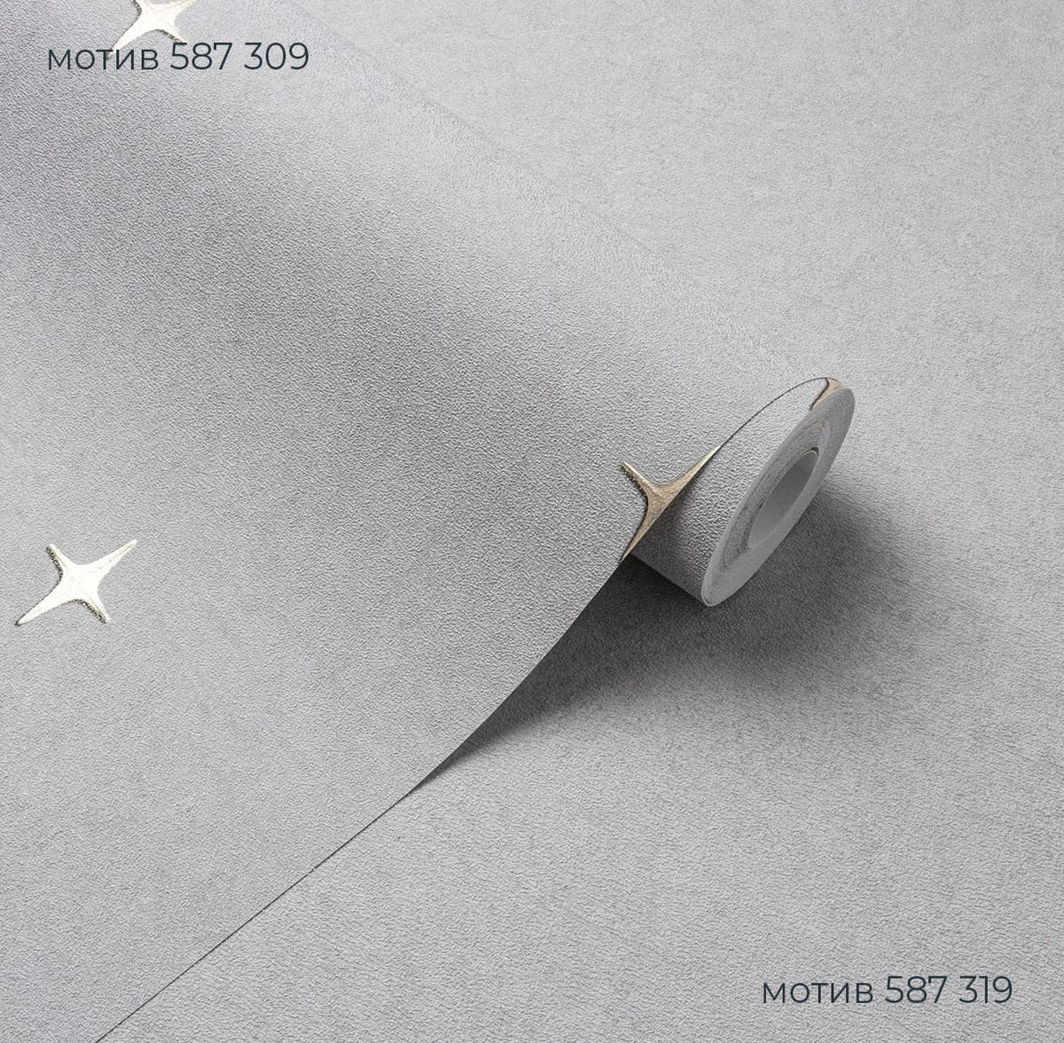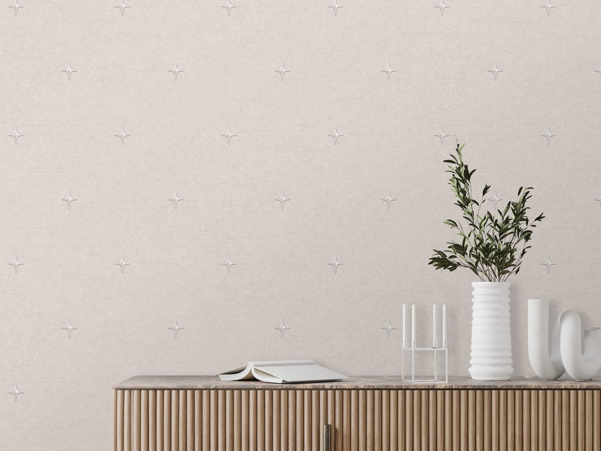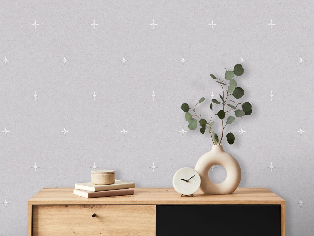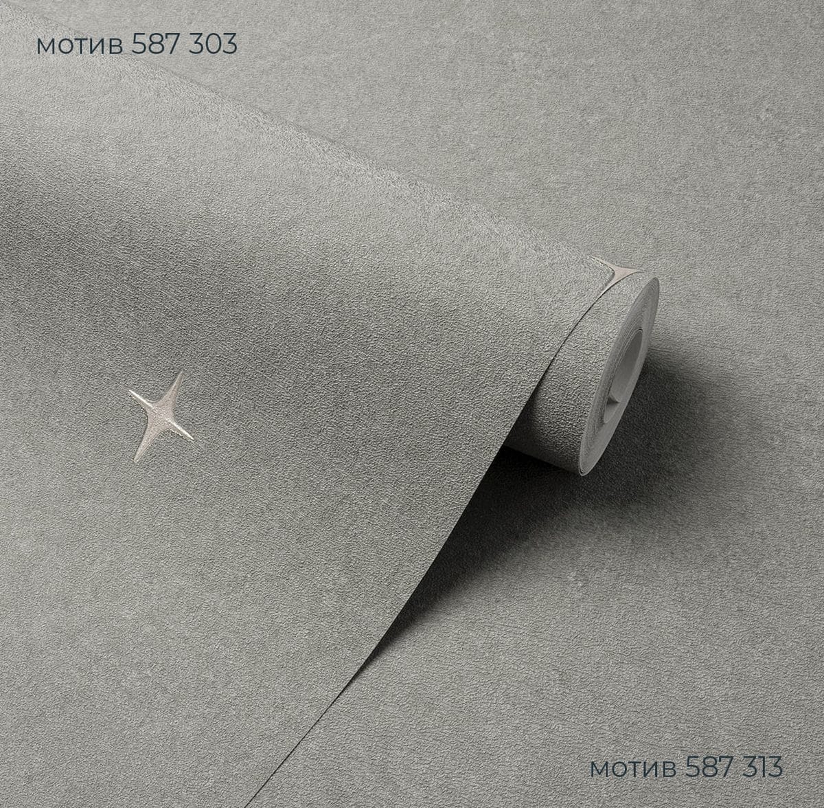 И на этом фоне — металлизированные звёзды. Стилизованные, графичные, с холодным мерцанием стали. Они не просто украшают поверхность — они создают движение. Свет скользит по металлу, вспыхивает и гаснет, меняя настроение интерьера в зависимости от угла и времени суток.