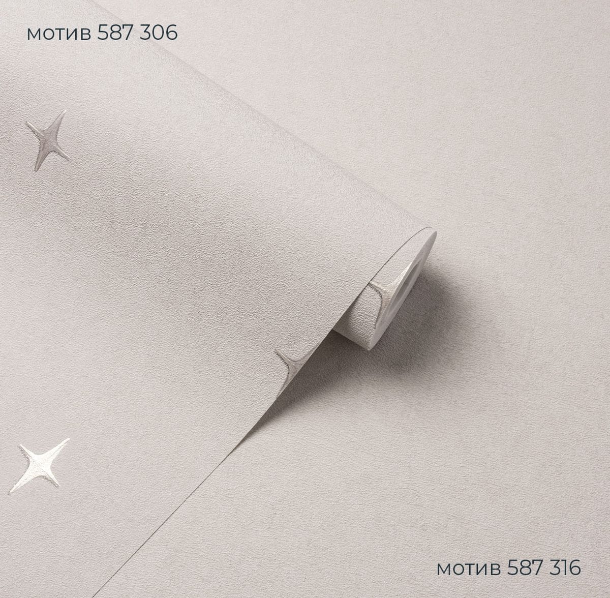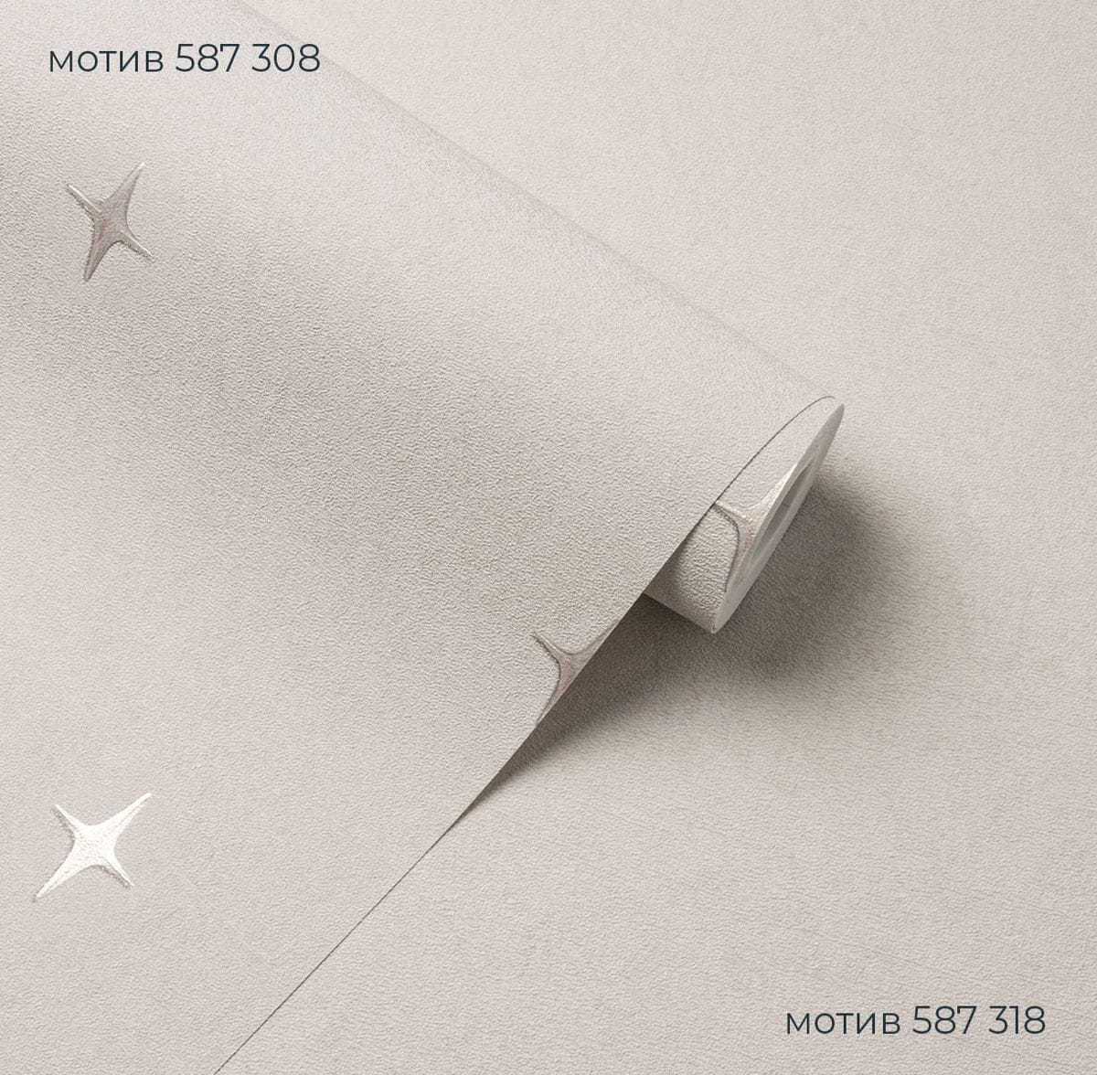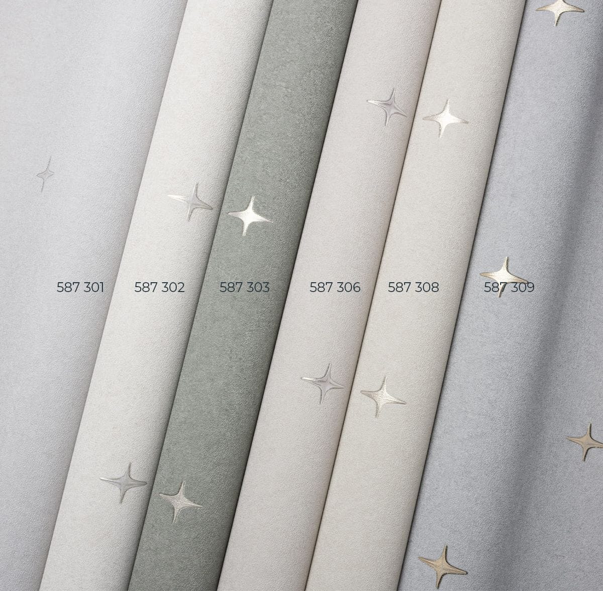 И на этом фоне — металлизированные звёзды. Стилизованные, графичные, с холодным мерцанием стали. Они не просто украшают поверхность — они создают движение. Свет скользит по металлу, вспыхивает и гаснет, меняя настроение интерьера в зависимости от угла и времени суток.