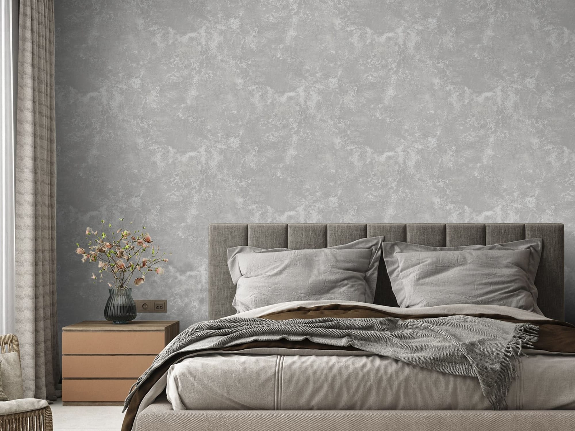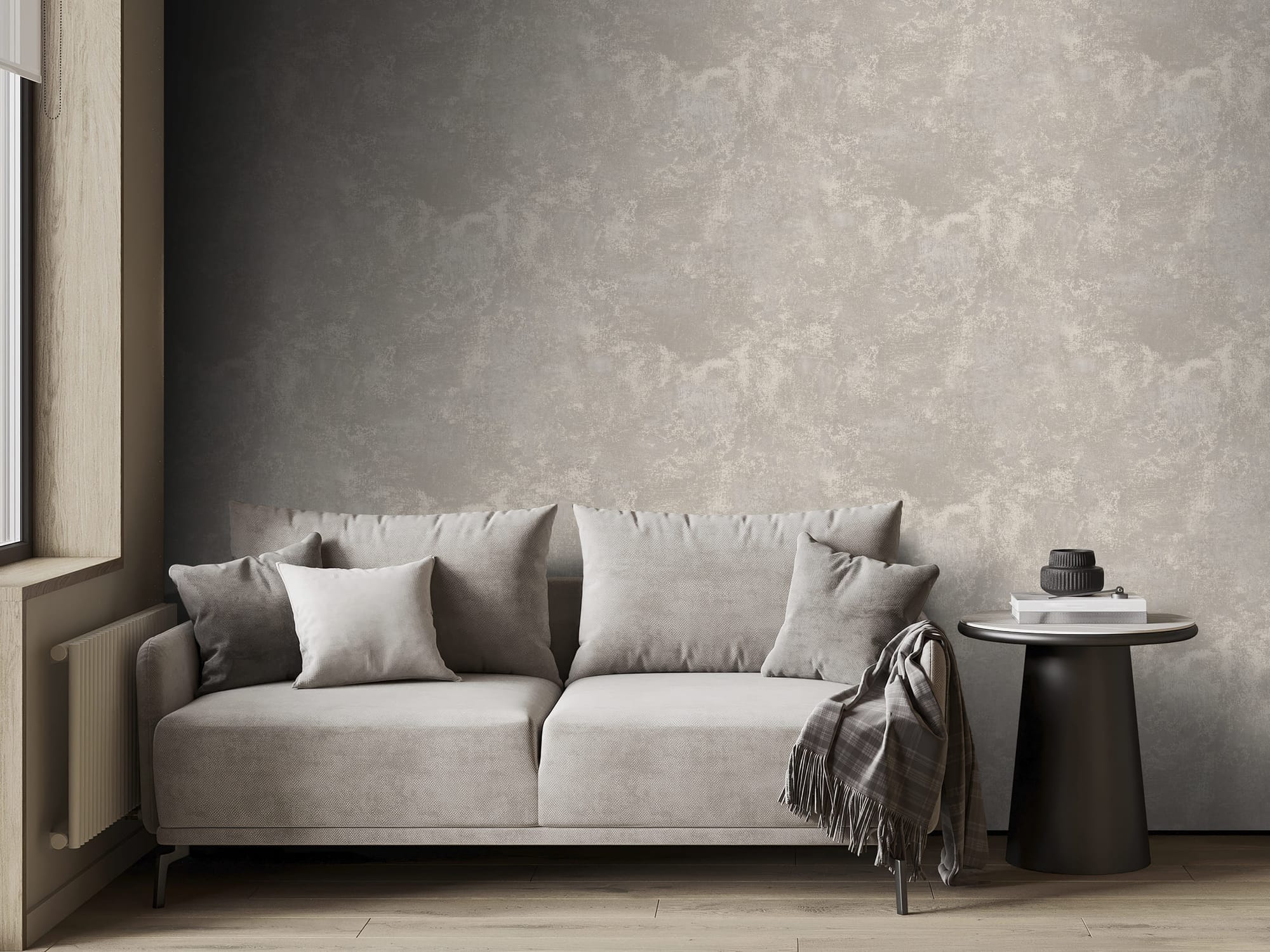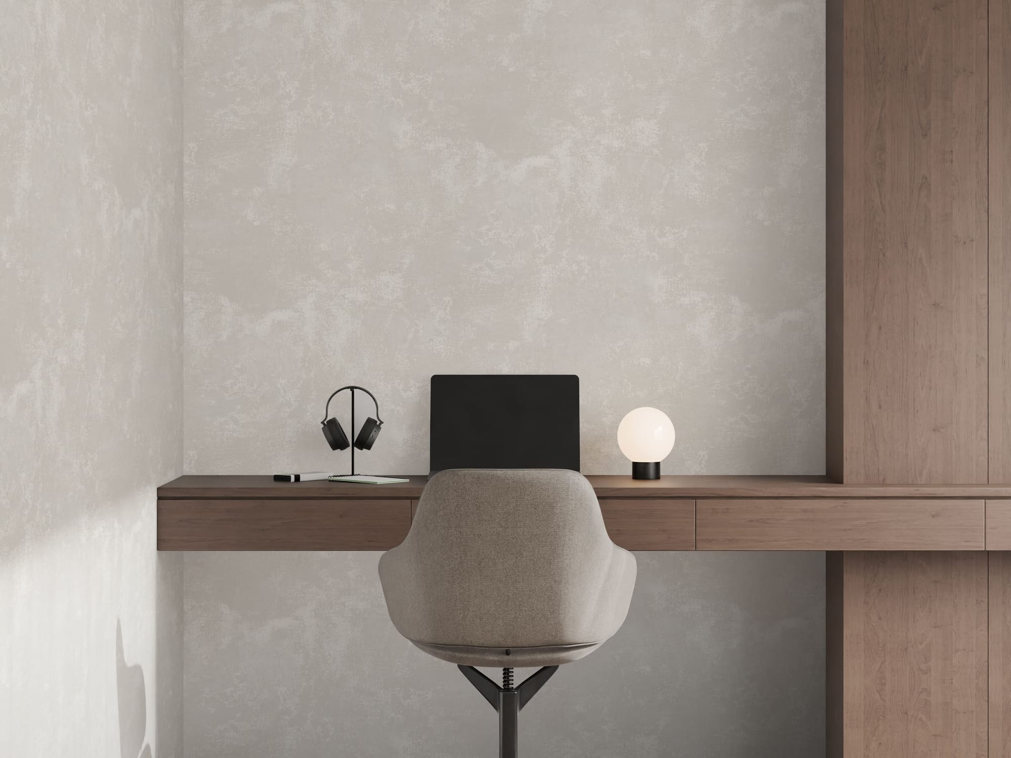 Фактура сложная, многослойная, тактильная. При естественном освещении она выглядит сдержанно и интеллигентно, а в искусственном свете — приобретает выразительность и характер. Пространство начинает «дышать», наполняясь глубиной и динамикой.